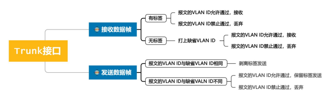 用于连接可以处理“携带标签数据帧”的设备,例如交换机、路由器等。链路类型为主干链路,可承载不同VLAN。数据帧通过Trunk接口时标签会被保留(即带标签发送),但接口缺省VLAN的数据帧会以Untagged的方式进行转发。具体工作流程如下图所示。