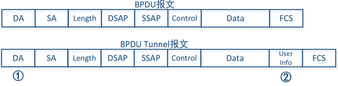 ②在FCS字段前加入用户信息字段,用于描述表示此报文为BPDU Tunnel报文。