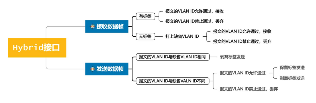 Hybrid接口是华为独有的接口类型,相比上面两种类型而言更加的灵活,但是配置相对复杂。Hybrid接口即可用于连接终端设备又可用于连接交换机、路由器、AP等设备,链路类型可以是接入链路也可以是主干链路,允许多个VLAN帧以带标签或不带标签的方式通过。Hybrid接口与Trunk接口工作流程基本相同,唯一区别是Hybrid接口允许多个VLAN帧以不带标签形式通过,而Trunk接口只允许携带缺省VLAN的帧以不带标签的方式通过,具体流程如图所示。