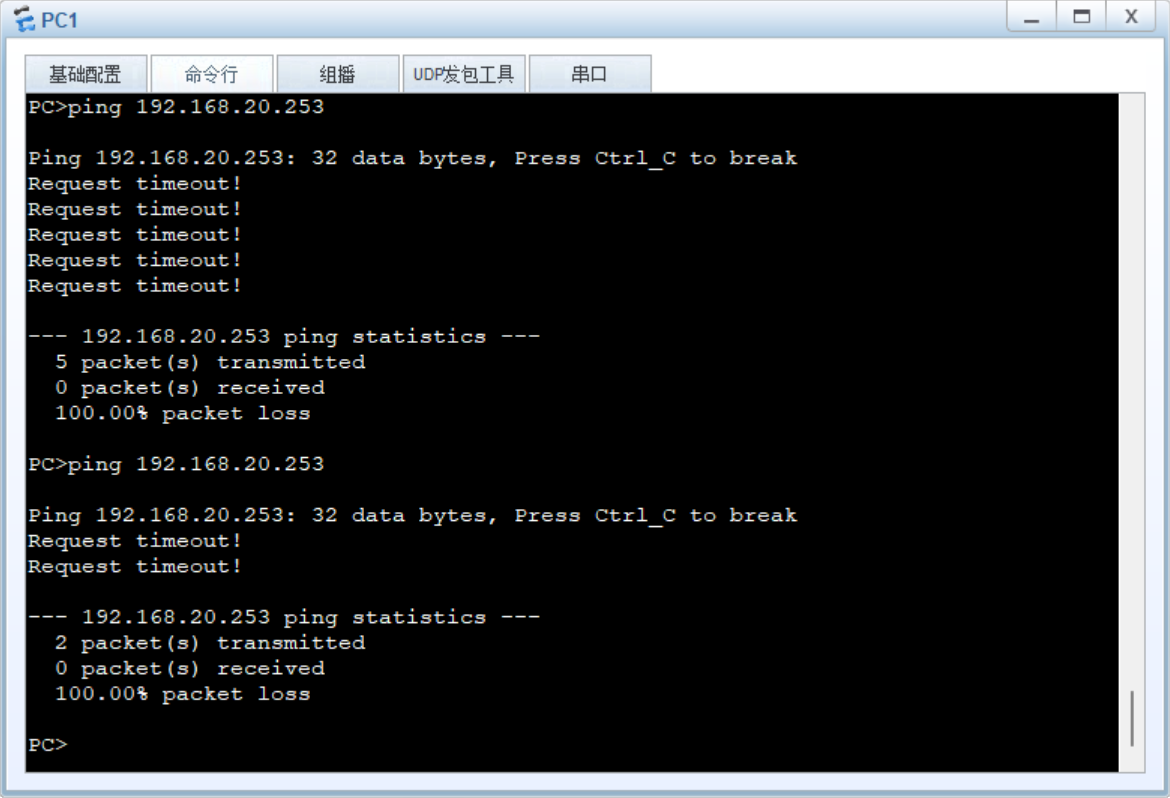 - 跨部门通信:PC1 ping PC2,验证 VLAN 隔离效果(应无法 ping 通)