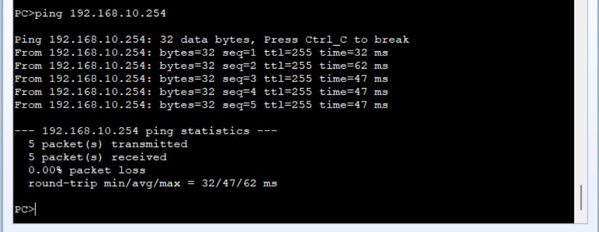 - 网关连通性:PC1 ping 192.168.10.254,验证三层可达性。
