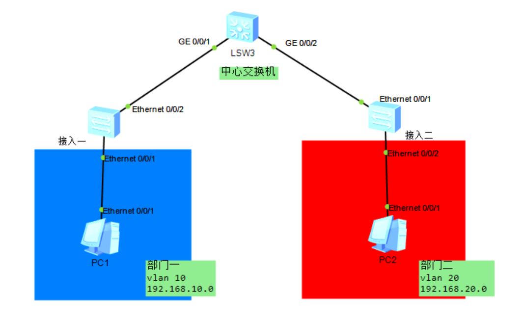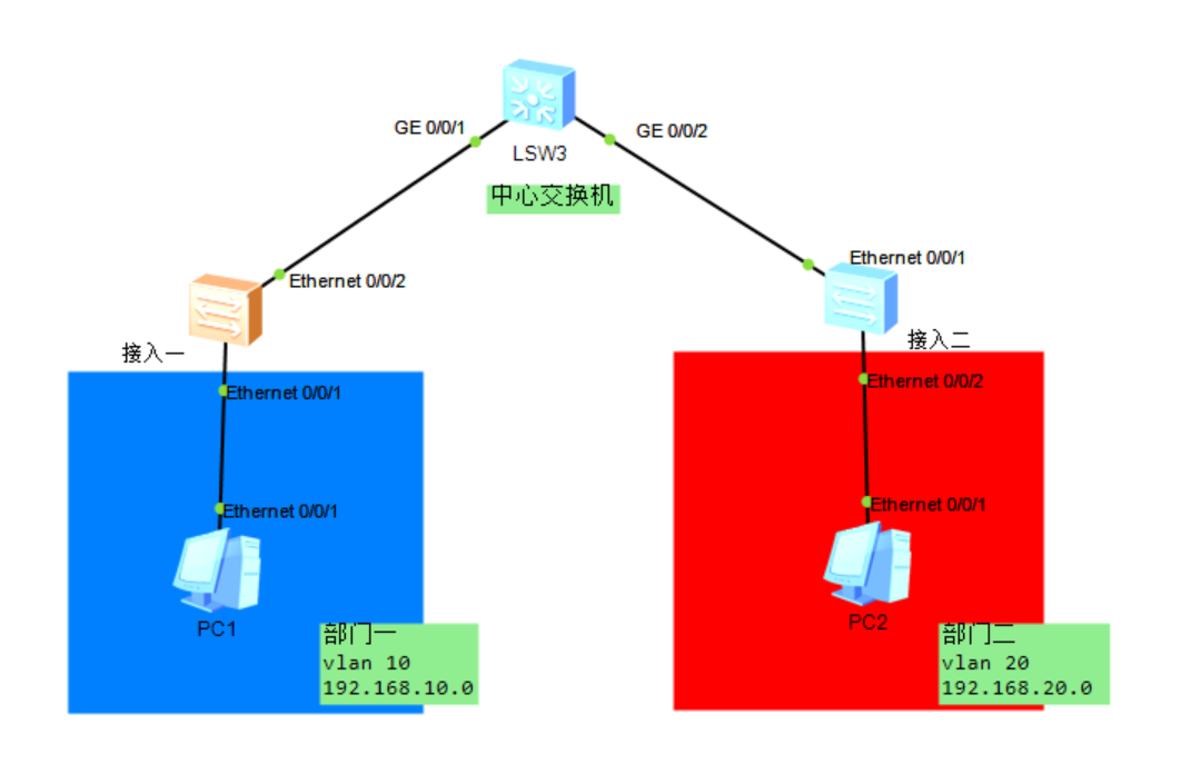 - 链路说明:接入层与中心交换机之间配置 Trunk 链路,允许 VLAN 10、20 通过;接入层连接 PC 的端口配置为 Access 模式并划入对应 VLAN。
