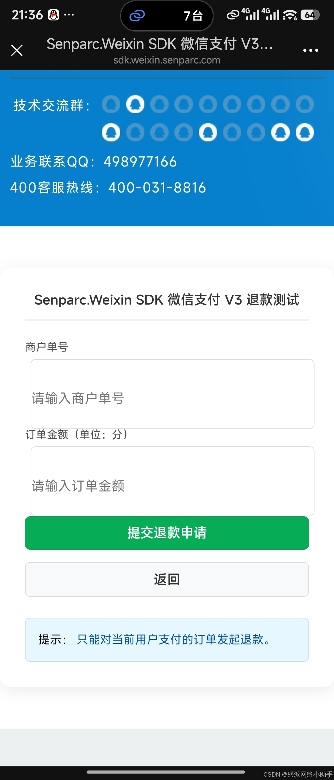 ✍️微信支付的 Sample 更新了手动退款的演示(之前会在支付完成后自动提示退款,此功能目前仍然保留),输入“商户单号”(在微信付款记录中查找),以及对应金额(单位为“分”),且必须为当前支付用户,即可测试退款。✍️测试路径:关注“盛派网络小助手”公众号,点击菜单“功能体验一”>“微信支付测试”,即可进入付款和退款测试。1.1 Work v3.30.1:修复企业微信群机器人发送文件消息时 med