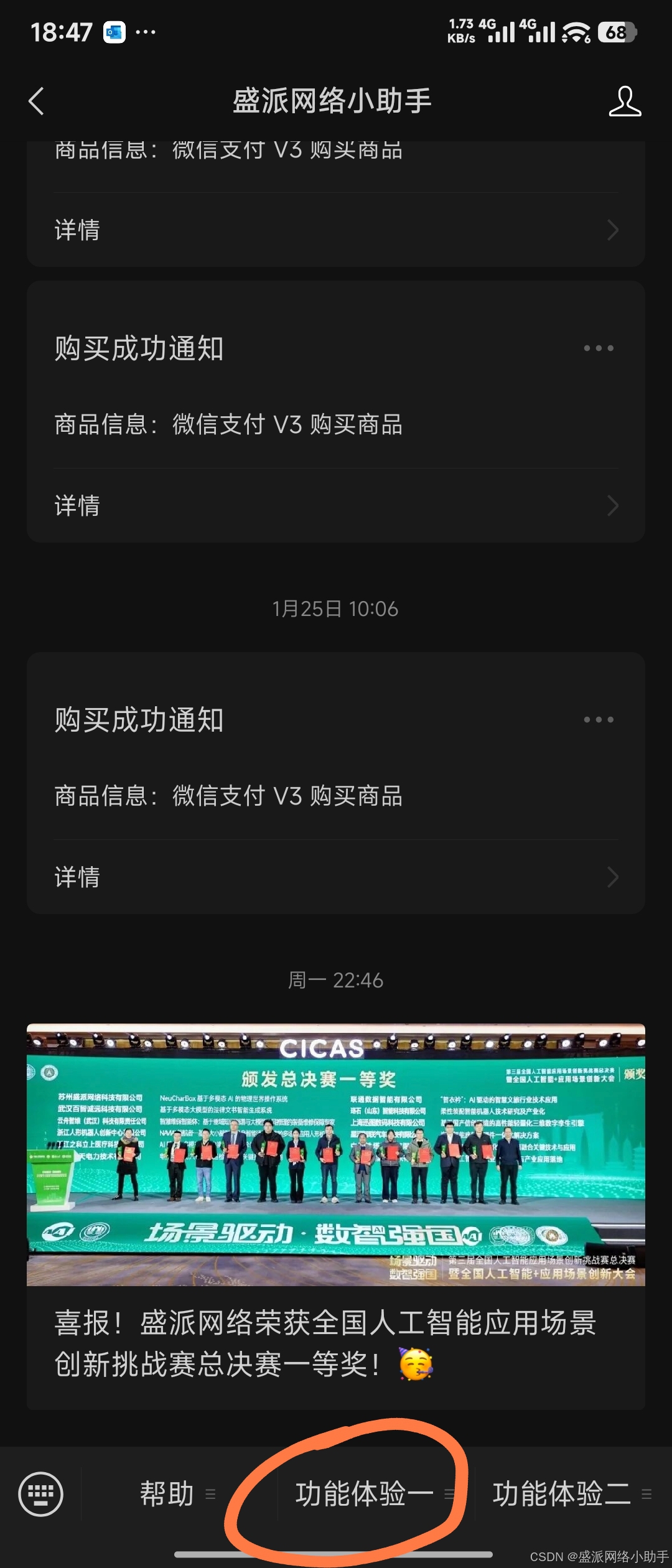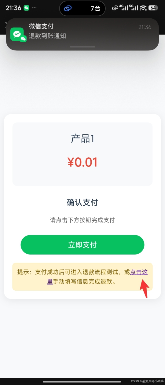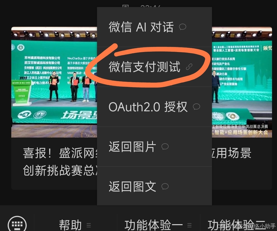 ✍️测试路径:关注“盛派网络小助手”公众号,点击菜单“功能体验一”>“微信支付测试”,即可进入付款和退款测试。