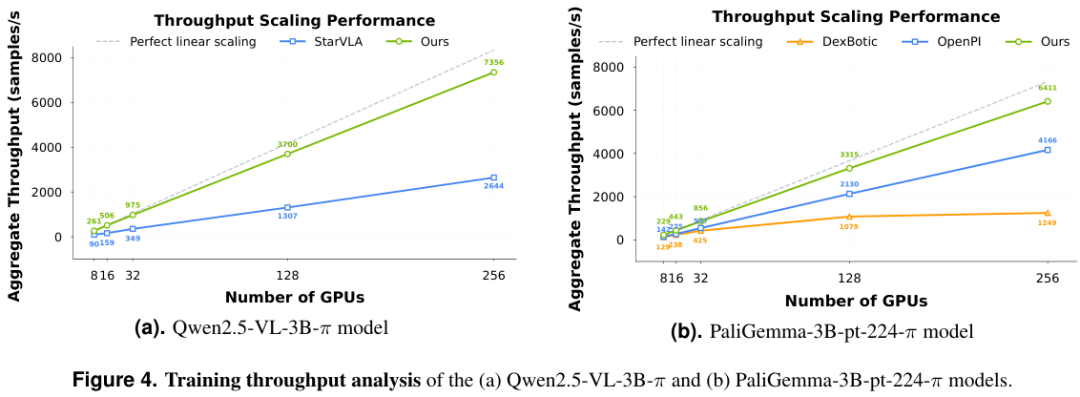 随着GPU数量的增加,LingBot-VLA的吞吐量几乎呈线性增长。框架具有极佳的可扩展性,非常适合在大规模集群上运行。