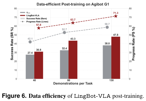 实验显示,LingBot-VLA具有极强的数据利用效率。