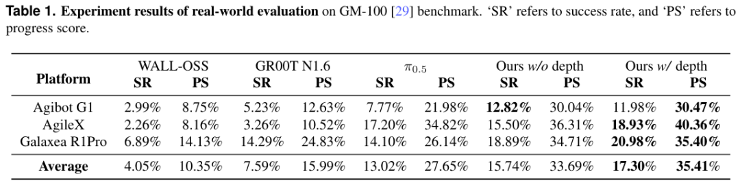 相比于π0.5模型,LingBot-VLA(带深度版)的平均成功率提升了4.28%,进度分提升了7.76%。
