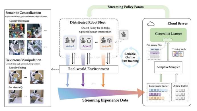 那么,是否有这样一套策略,可以支持机器人群“随到随学”,随时调整?即真实部署环境中,把数据回流、模型后训练和策略更新,组织成一个长期可运行的工程系统,让更多的机器人在真实环境中不会因为“没见过,没练过”而宕机。