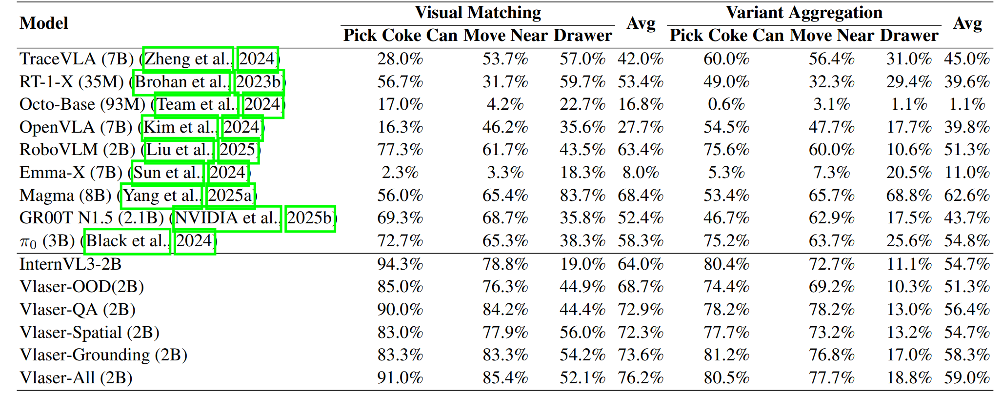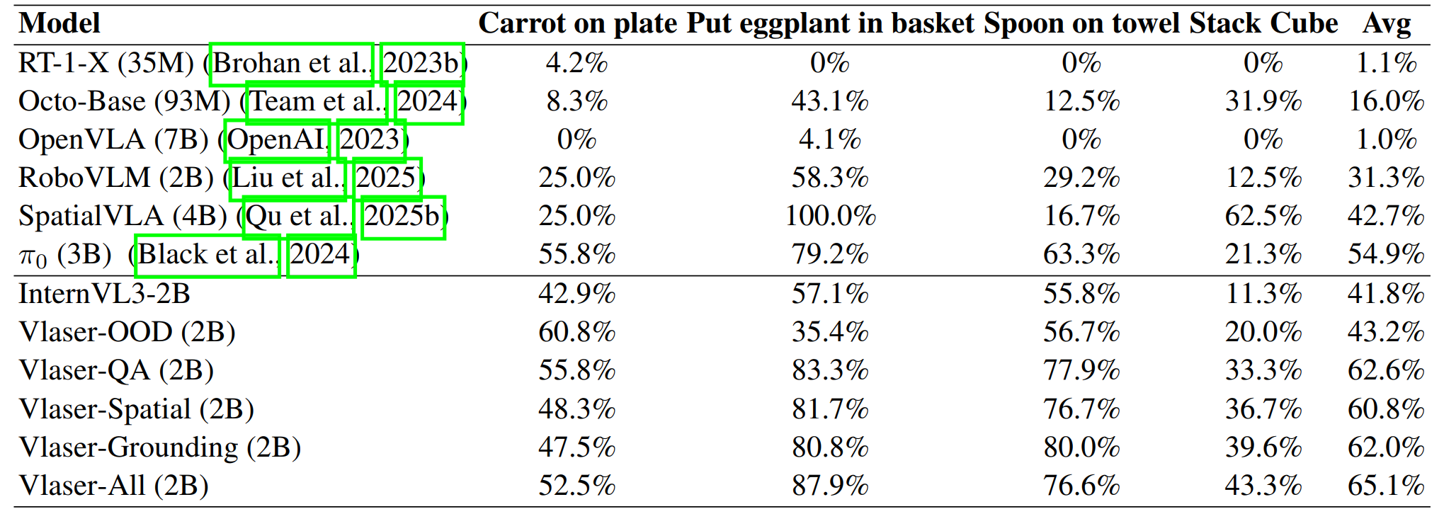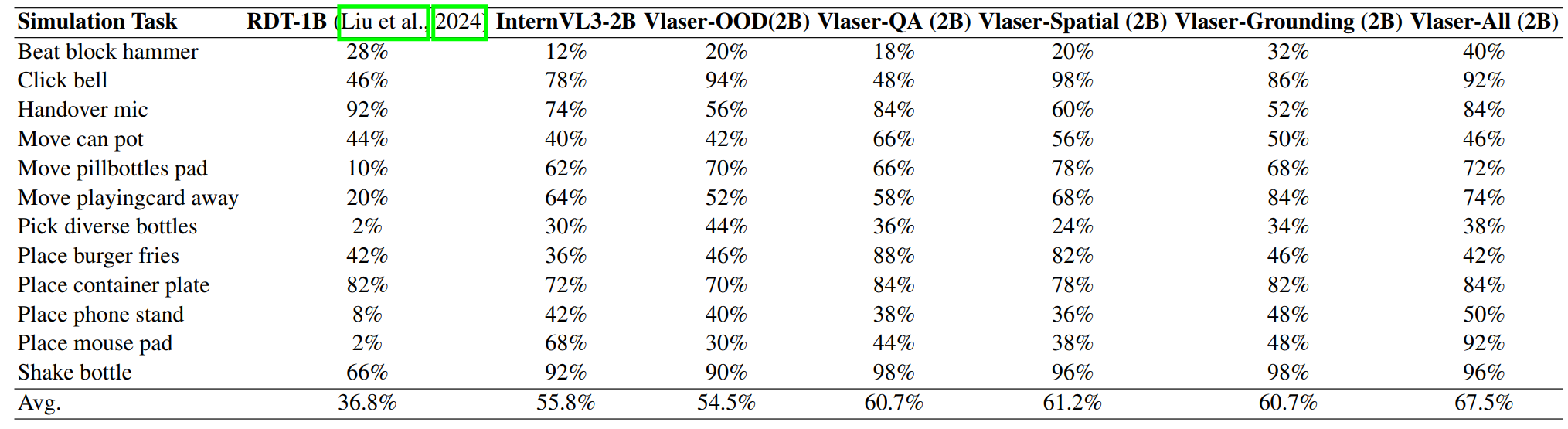 Vlaser-All更是达到了 76.2%,显著优于基线的 64.0% 和 68.7%。