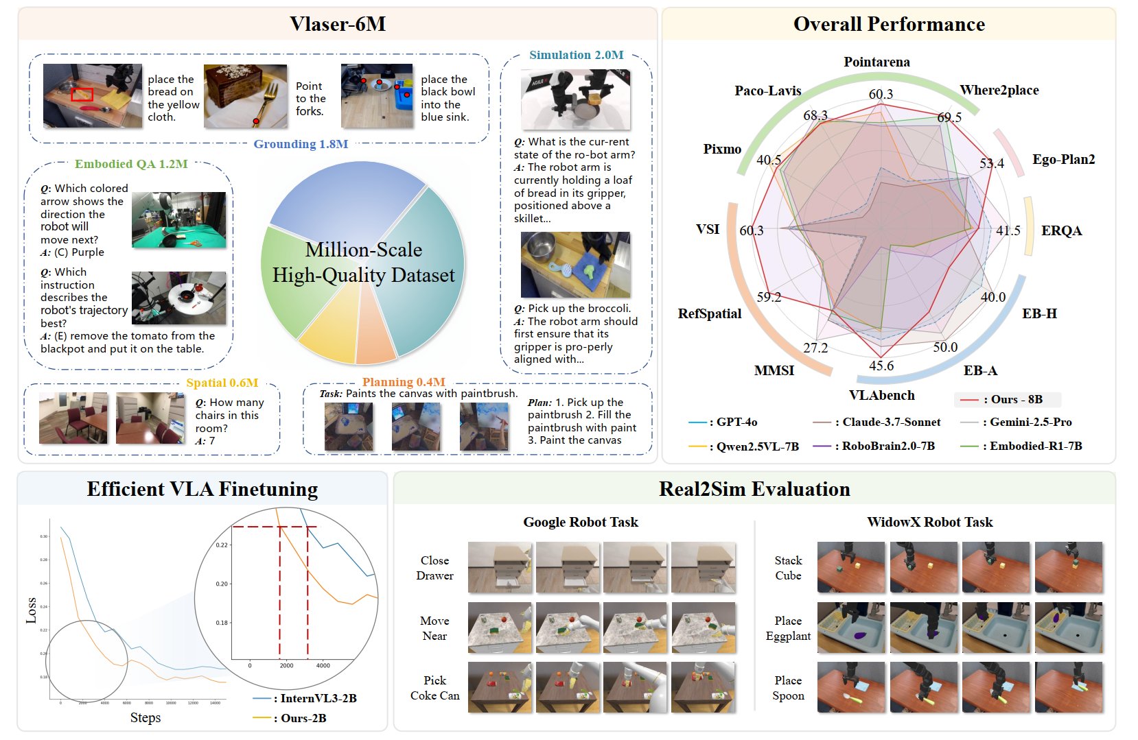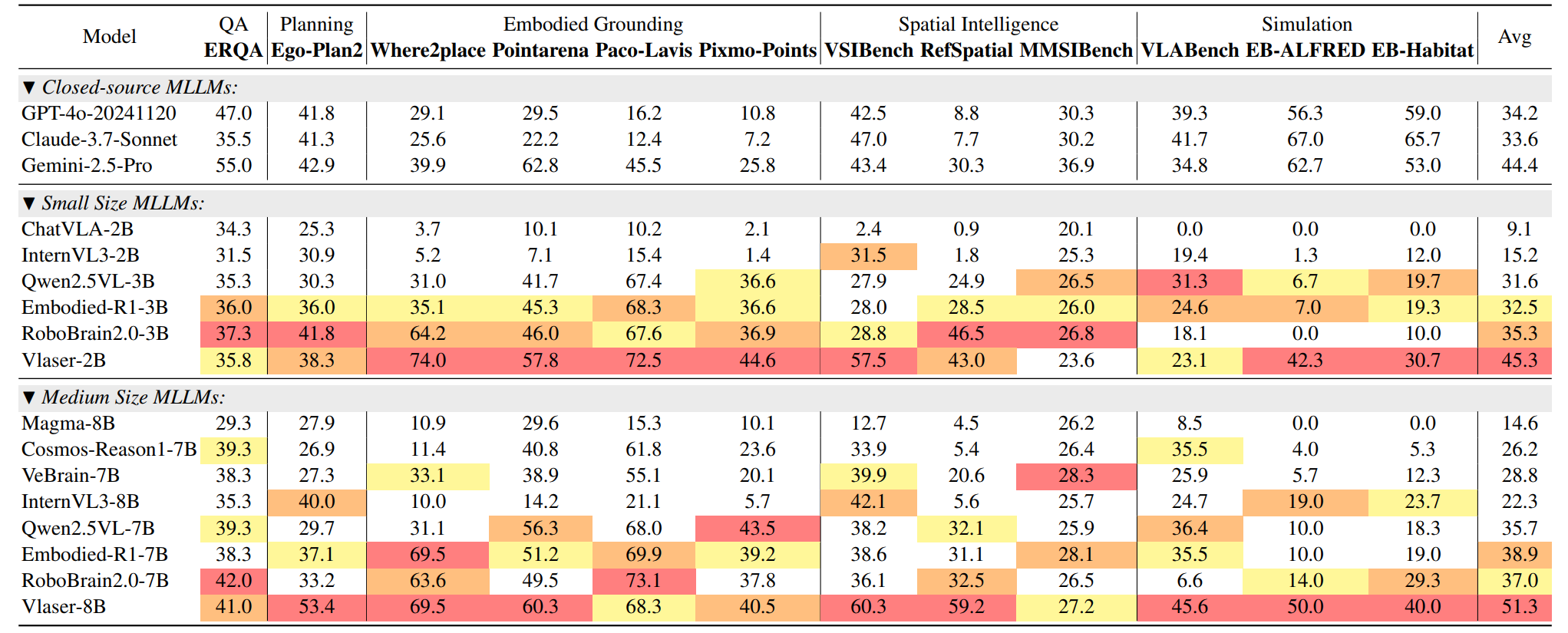 - Vlaser-8B (SOTA): 在同等规模模型中,Vlaser-8B 平均分高达 51.3。这一成绩显著超越了 GPT-4o (34.2)、Gemini-2.5-Pro (44.4) 等闭源模型,以及 RoboBrain2.0-7B (37.0) 和 Embodied-R1-7B (38.9) 等同类具身多模态大脑大模型。