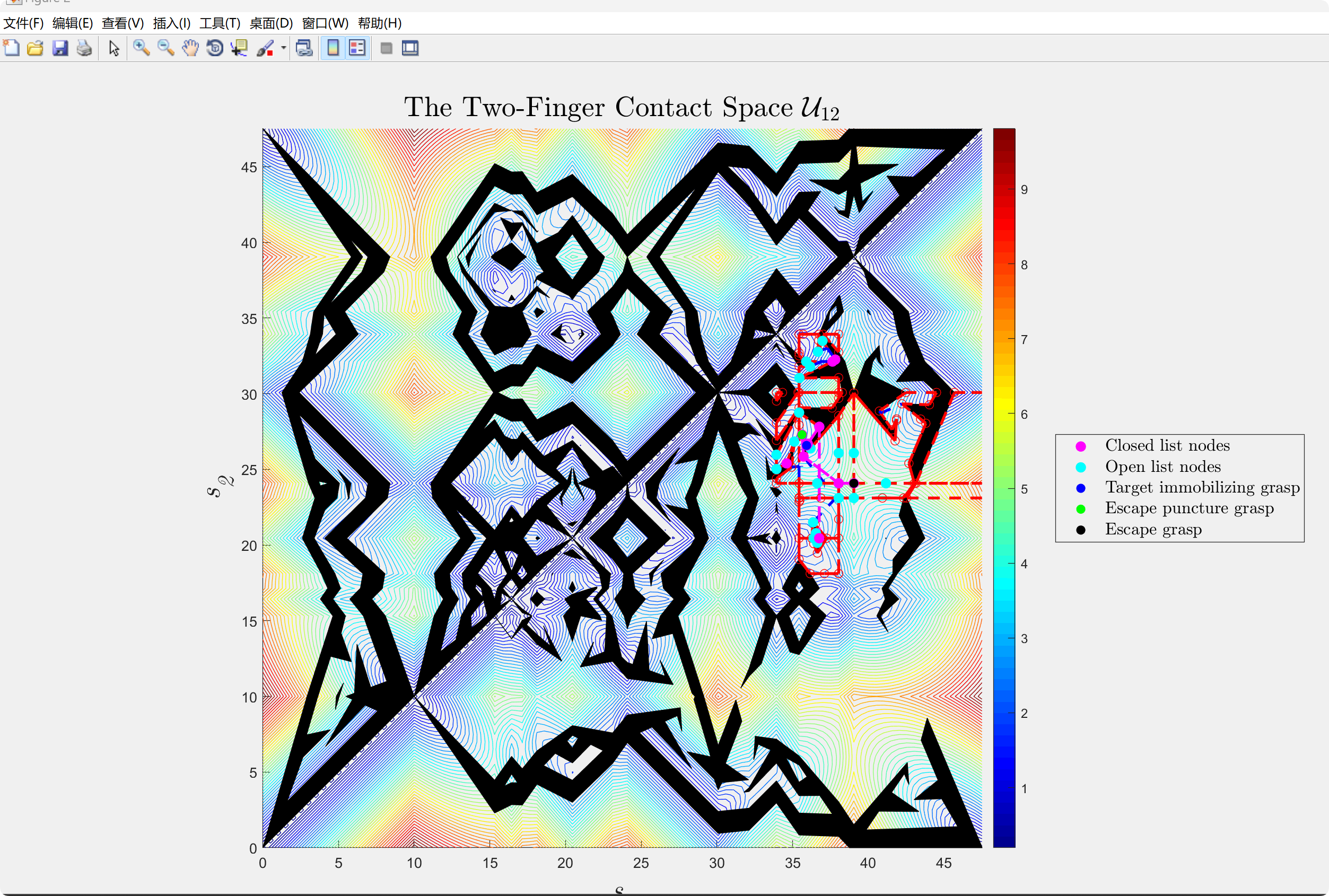 - 从一个初始的固定抓握形态出发,算法开始在手部接触空间中搜索可能的笼状区域。