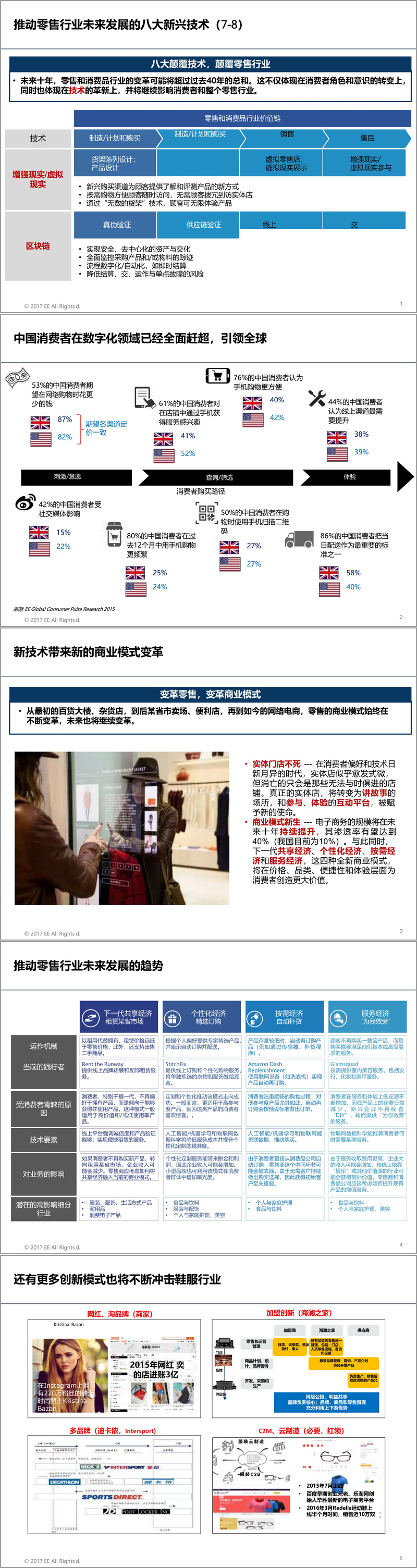 第三,新技术催生了全新的商业模式。实体门店并未消亡,而是转型为“讲故事”的场所和互动体验平台。下一代共享经济、个性化经济、按需经济和服务经济正在崛起。例如,租赁代替购买、精选订购、自动补货以及“为我效劳”式服务,正在价格、品类、便捷性和体验层面为消费者创造更大价值。网红经济、C2M模式、云制造等创新形态也在不断冲击传统鞋服行业结构。