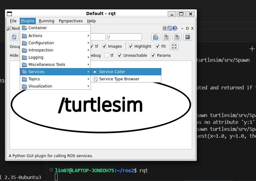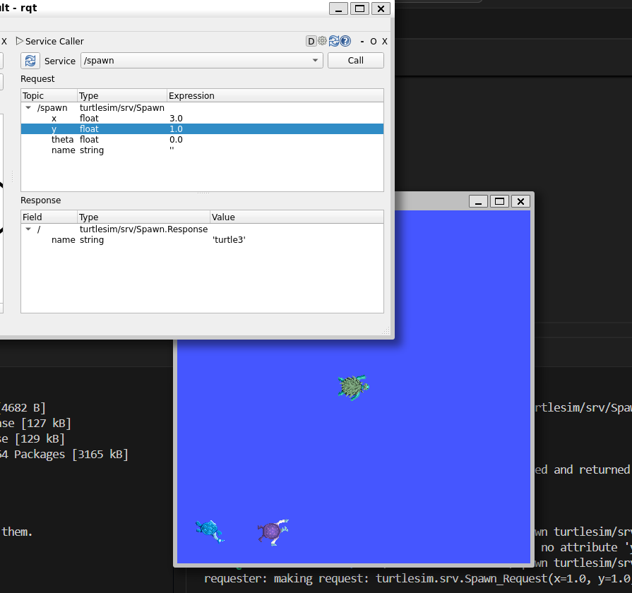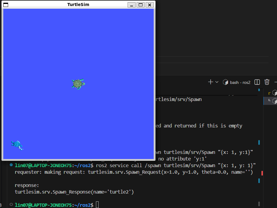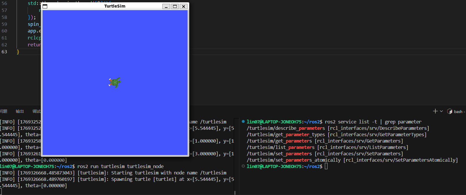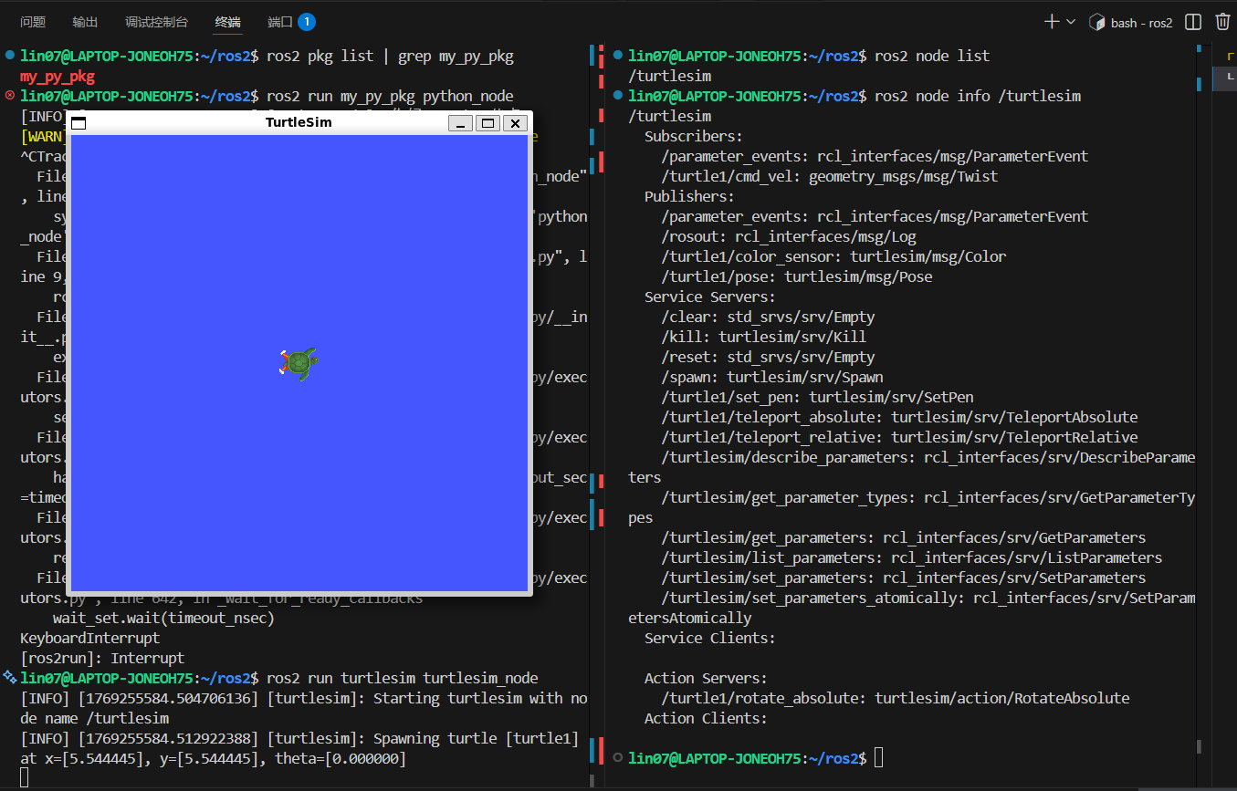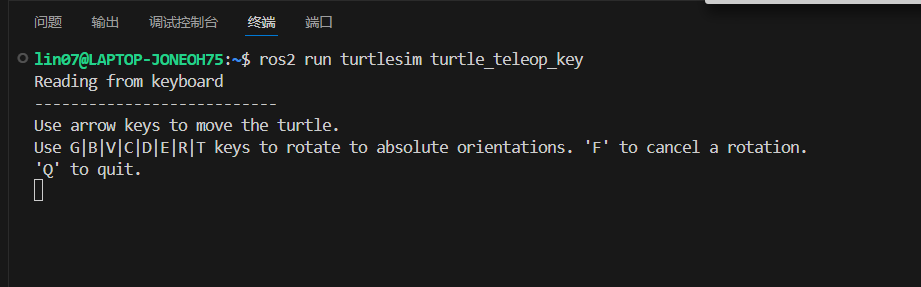 可以看得“teleop_turtle”(海龟键盘控制节点)和“turtlesim_node”(小海龟模拟器节点)两个节点