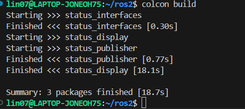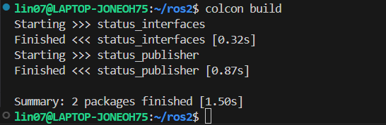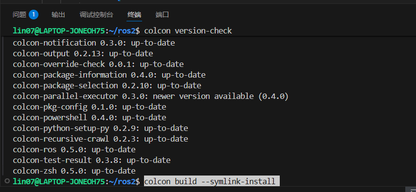 最后就可以该项目的构建功能包了,因为我的src文件夹下只有一个功能包,所以可以直接“colcon build”编译所有功能包(基础编译,修改代码后需重新编译),若有多个则“colcon build --packages-select 包名”编译指定功能包。“colcon build --symlink-install”命令更推荐,能创建源码软链接,修改Python代码无需重新编译(只适用于Python功能包构建)