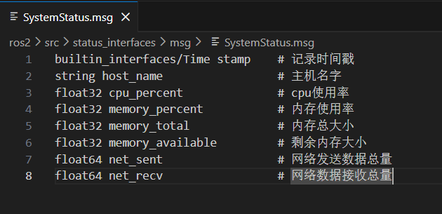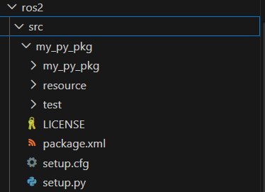 执行完上述命令后,my_py_pkg功能包目录的结构如下图。my_py_pkg子目录是Python 节点源码的专属存放目录(和功能包同名);resource子目录是ROS2功能包的元数据目录,存放包的标识信息,无需手动修改,由系统自动维护;test子目录是测试代码存放目录,用于编写单元测试或集成测试,新手阶段可以暂时忽略;LICENSE文件是功能包的开源许可证文件;package.xml文件是功能包的核心元信息与依赖声明文件,包含包名、版本、作者、依赖库等,ROS2系统通过它识别功能包的基本信息和依赖关系;setup.cfg文件是辅助配置文件,主要用于配置Python包的安装路径和脚本入口,一般无需手动修改;setup.py文件是Python功能包的编译与安装配置文件,核心作用是声明节点的可执行名、入口函数、安装路径等,是让你的 Python 节点能被ros2 run启动的关键配置文件。