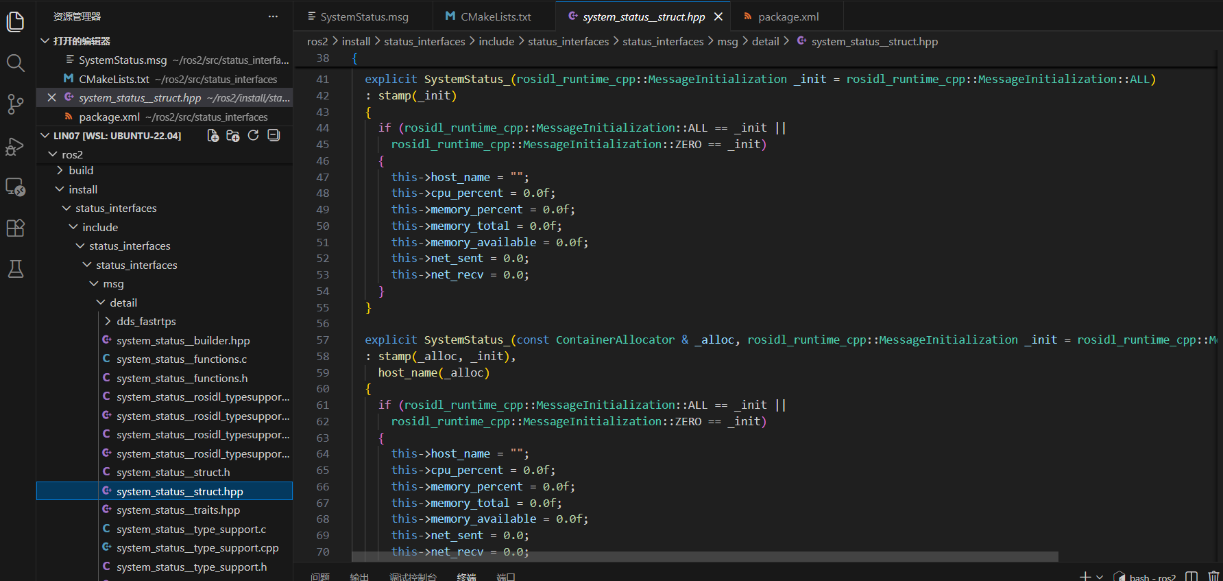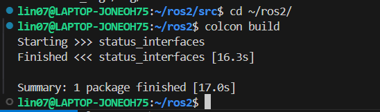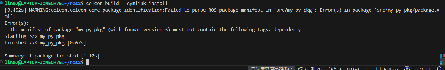 回车后的结果如下(警告是我开始的package.xml里用了过时的依赖标签,上面的代码均正确,已修改为新版的<depend>)
