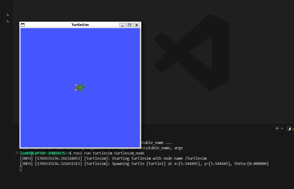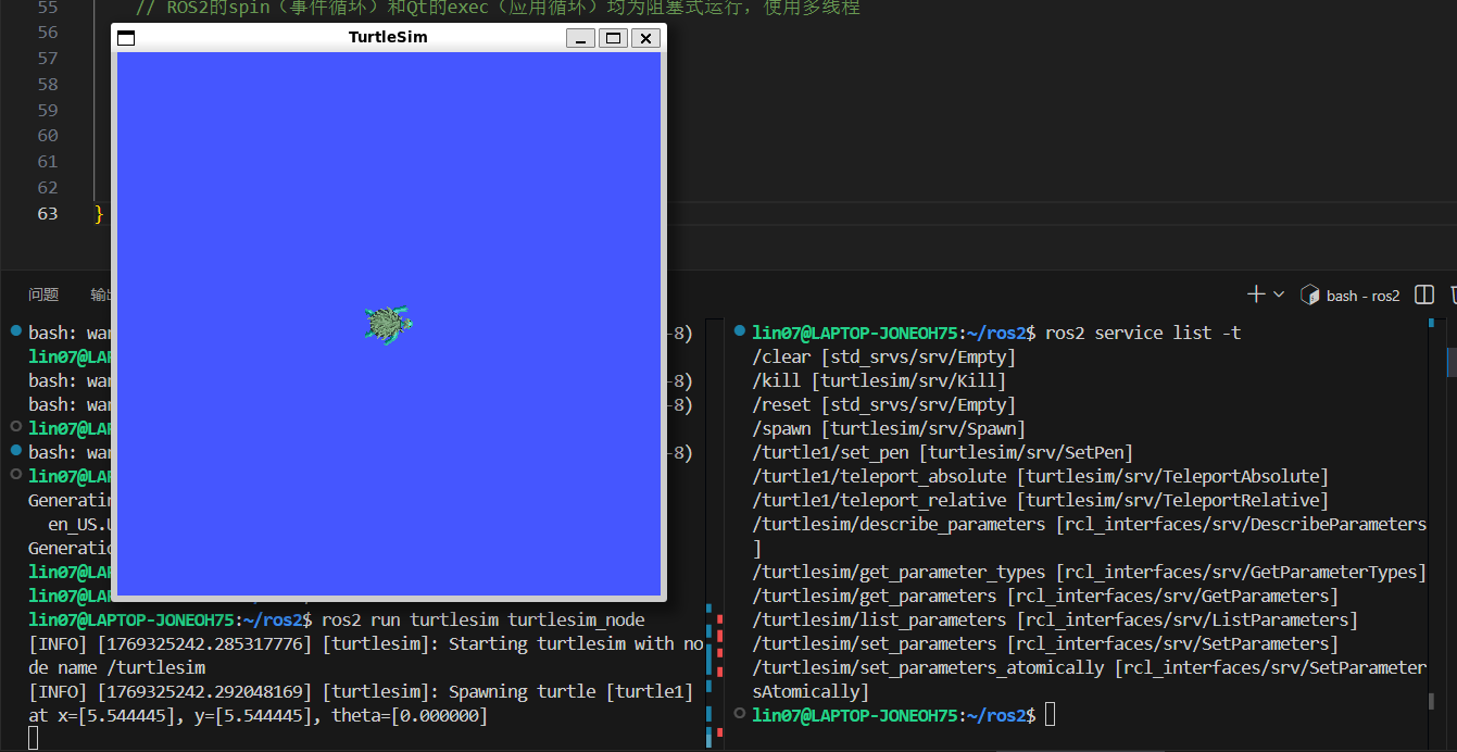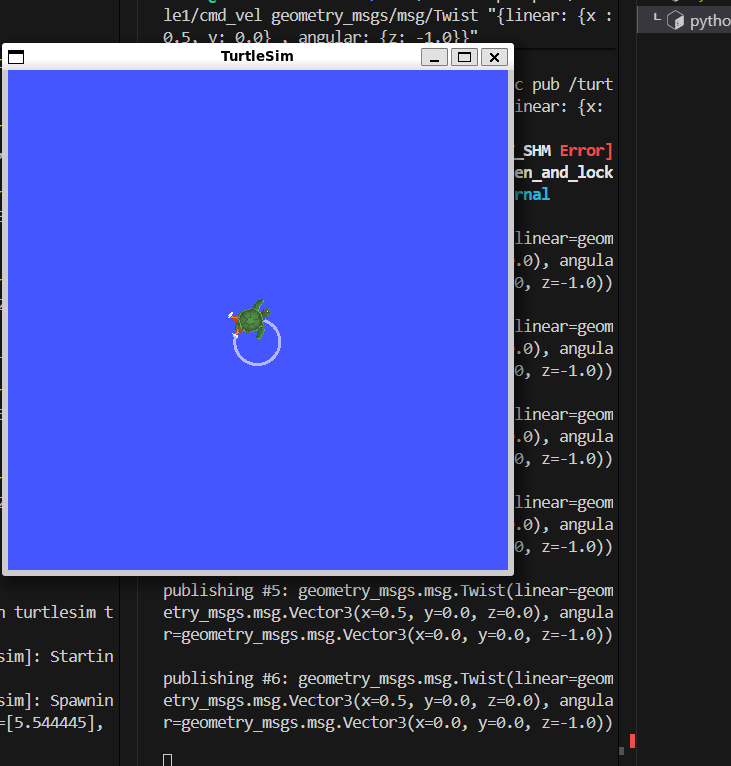 整个流程就是:teleop_turtle通过键盘获取你的操作,转换成线速度/角速度数据,通过/turtle1/cmd_vel话题发布,turtlesim_node持续订阅该话题,获取数据后控制小海龟移动
