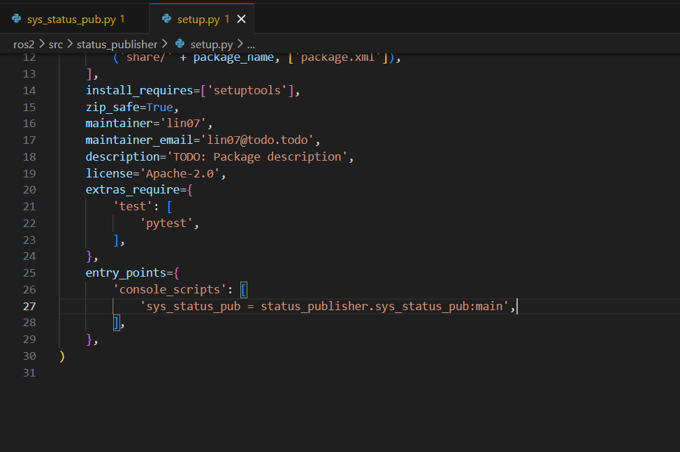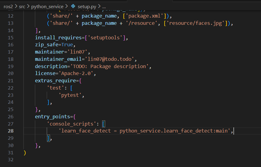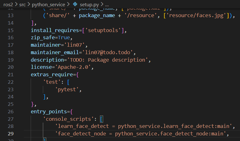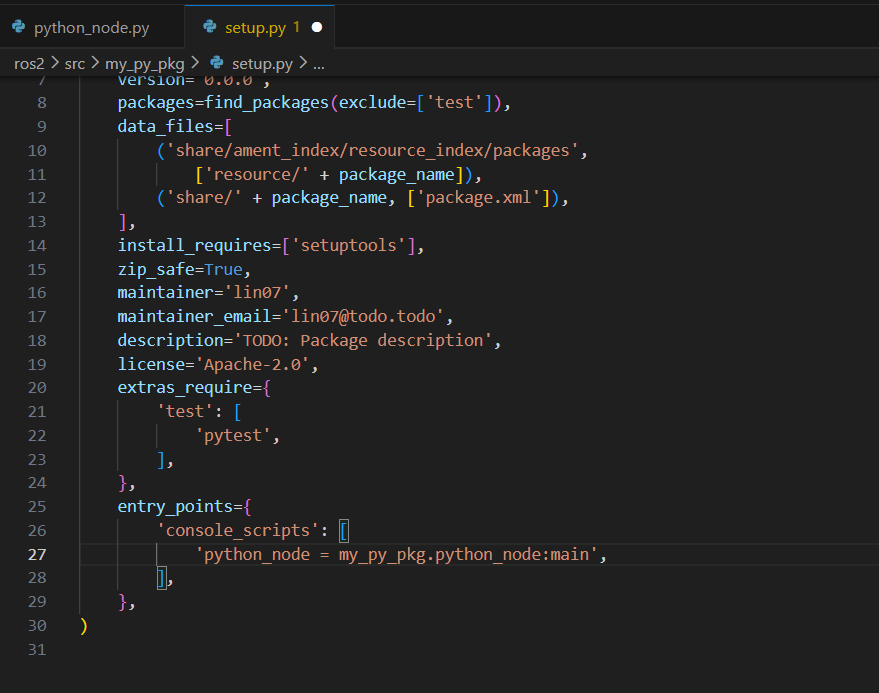 但需要去setup.py文件声明,找到entry_points里的console_scripts。第一个'python_node'是可执行文件名字,可自定义,后面是文件地址+要调用的函数名