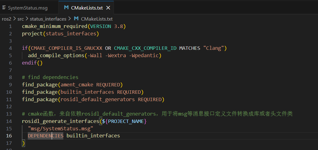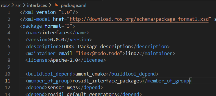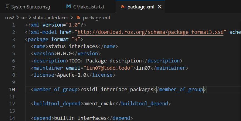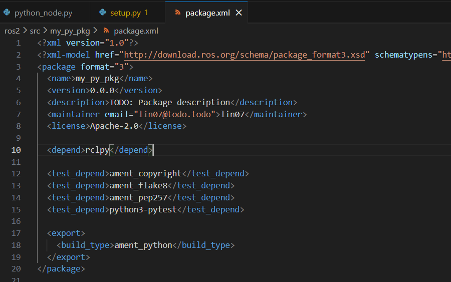 我们的节点代码里的rclpy库还没添加,去package.xml文件中添加依赖声明