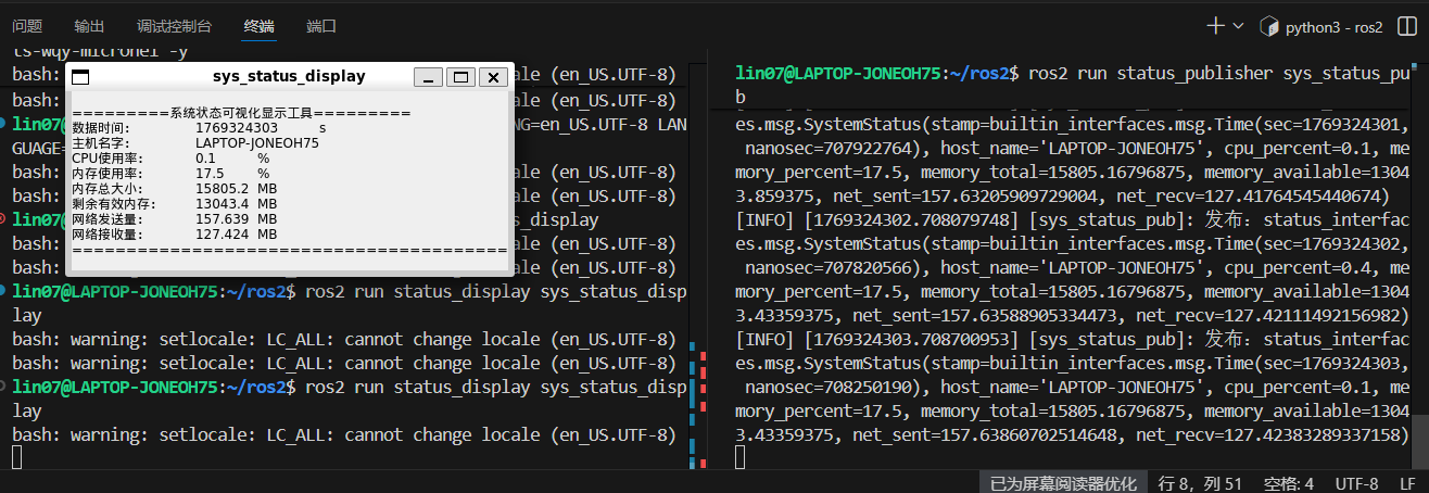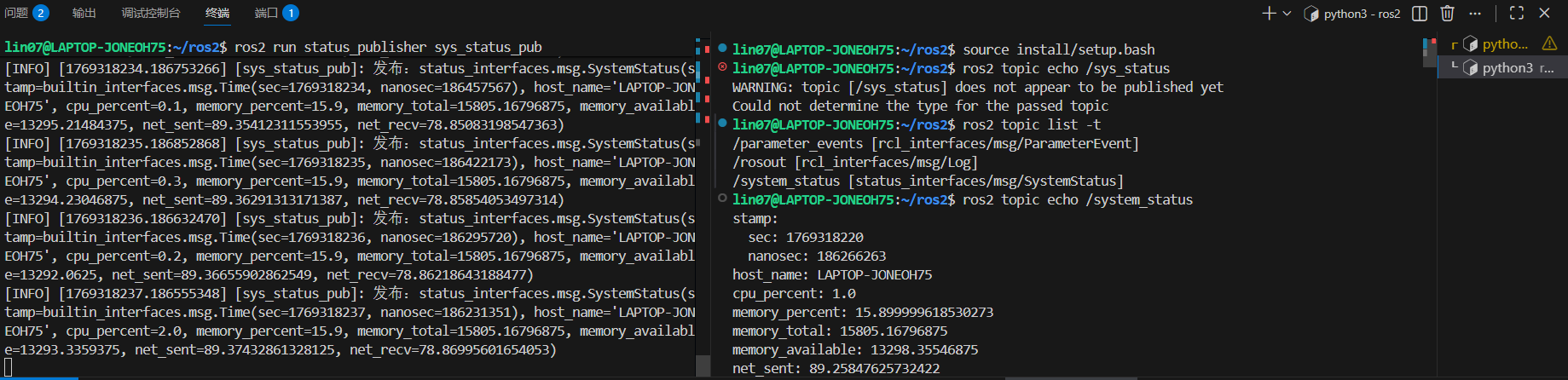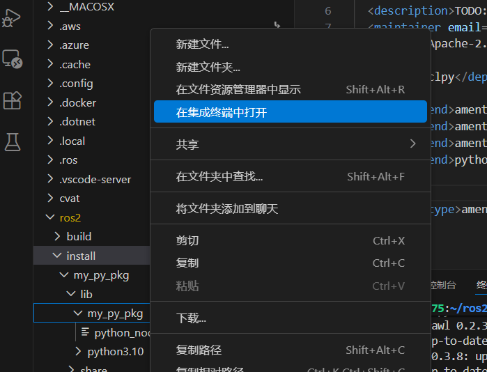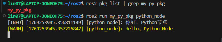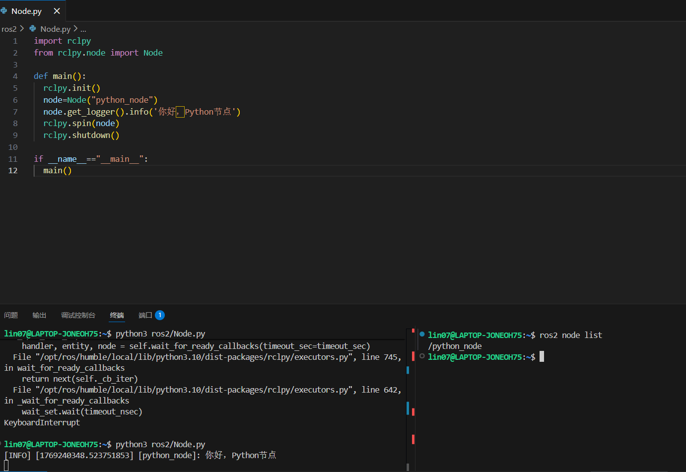 因为我们前面是用“colcon build --symlink-install”构建的,我们修改src/里的.py文件后,无需重新编译,直接重启节点(中断正在运行的程序,重新运行)就能加载最新代码(若是使用colcon build构建的,则还需重新执行colcon build)