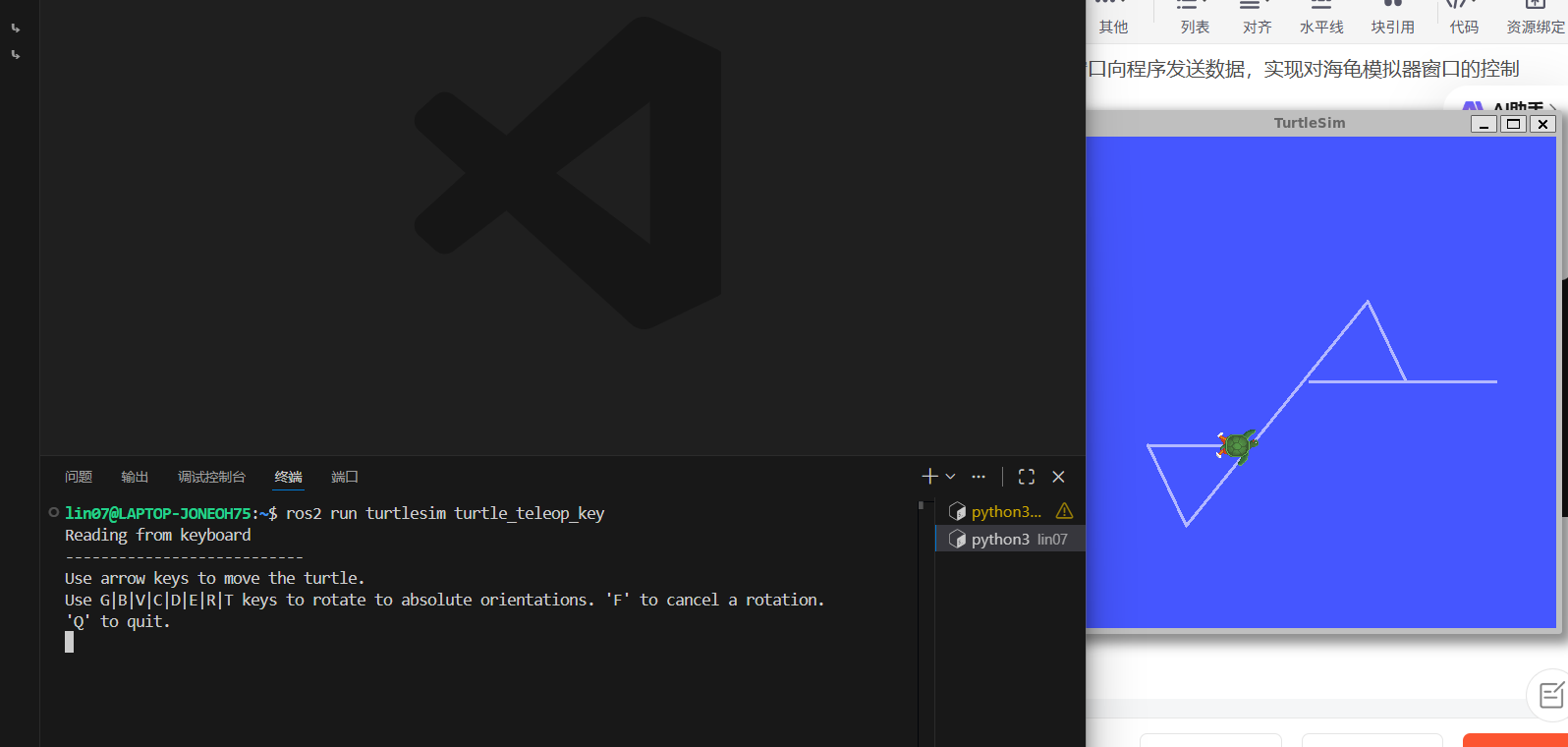 回车就可以进行控制了,注意,光标要放在该终端处,不是点海龟窗口。可能会遮挡什么的,自己调整合适窗口就可以了