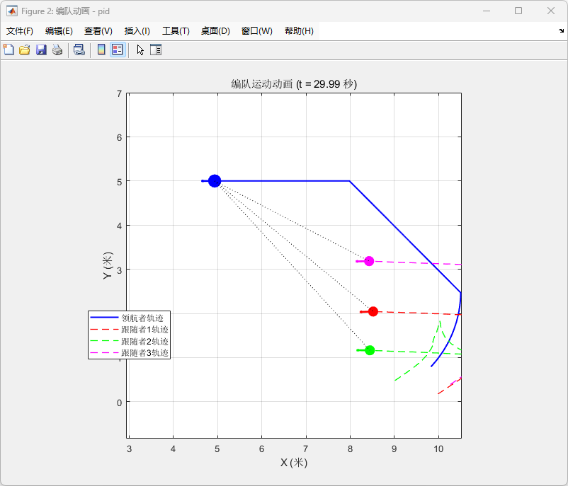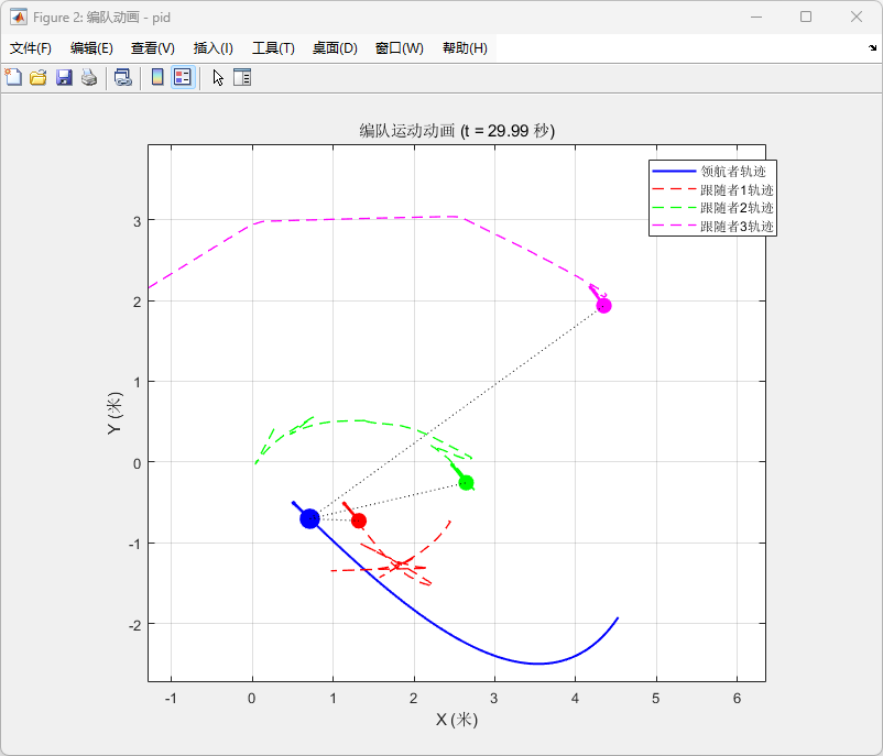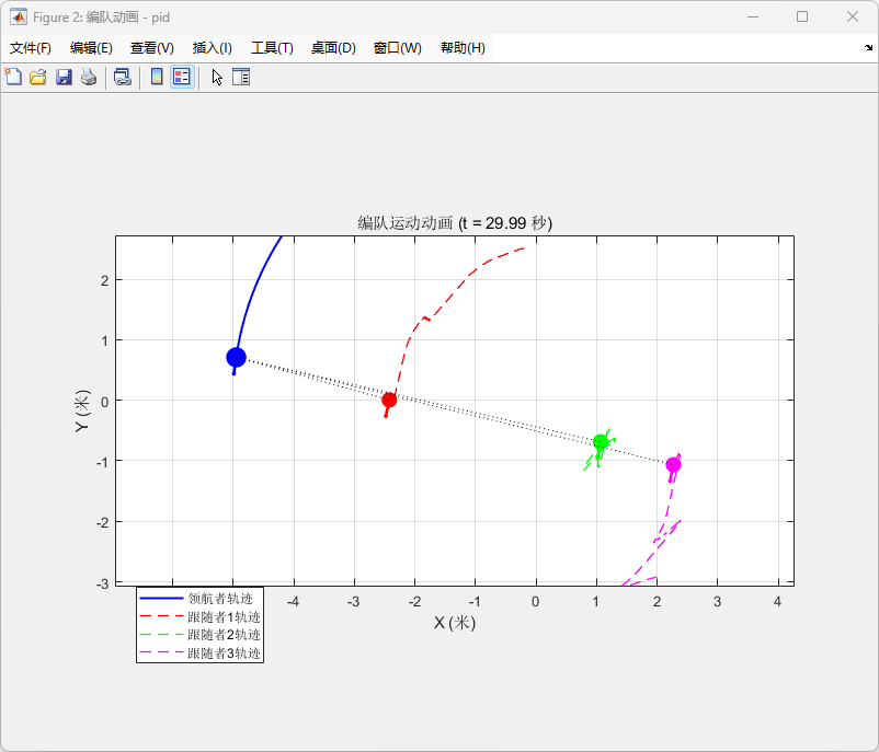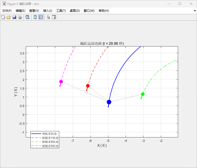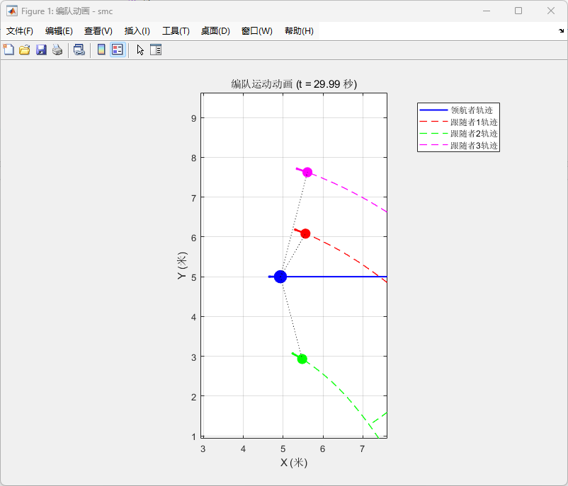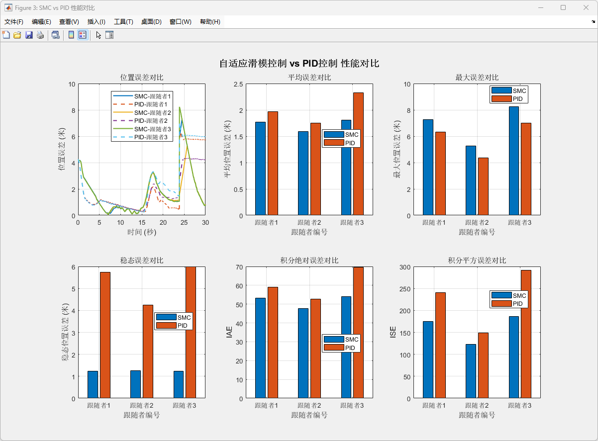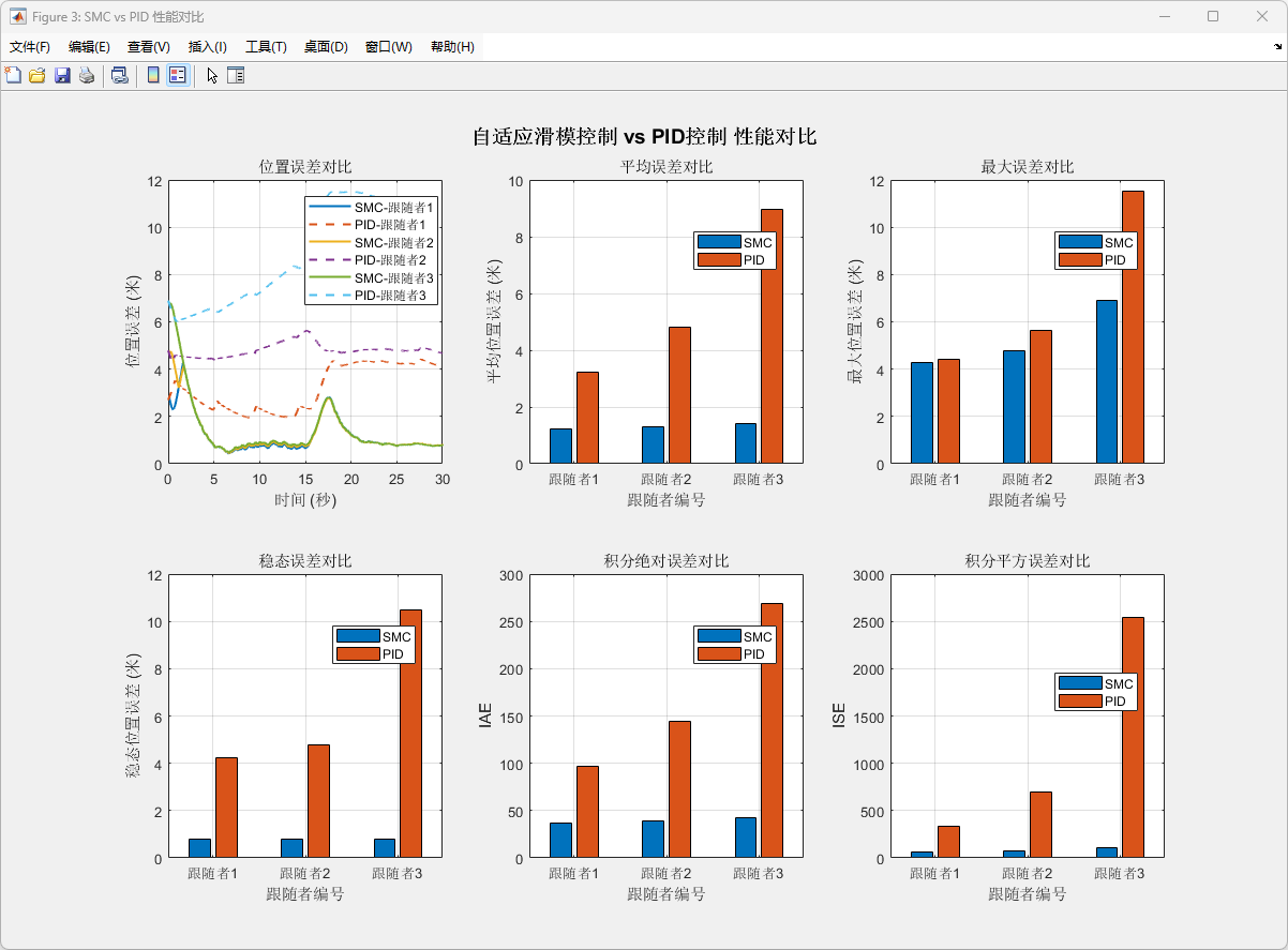 结论:结果优秀,甚至比圆形轨迹表现更好。 在更复杂的八字轨迹(Lissajous曲线)下,SMC平均误差仅1.03米,PID为3.51米,性能差距3.4倍,这比圆形轨迹的4.4倍差距更小,说明PID参数优化后在复杂轨迹下也能良好工作。从轨迹动画可以看出,SMC编队紧凑流畅地完八字跟踪,PID虽有偏离但仍能保持编队形态,没有出现失控或发散。特别值得注意的是,八字轨迹涉及频繁的方向变化和曲率变化,对控制器要求更高,但两个控制器都成功应对了这一挑战,PID的70%性能改善和91%的ISE改善都证明了参数优化的有效性。这组数据圆形轨迹结果相互印证,进一步确认了实验的可靠性和科学性。