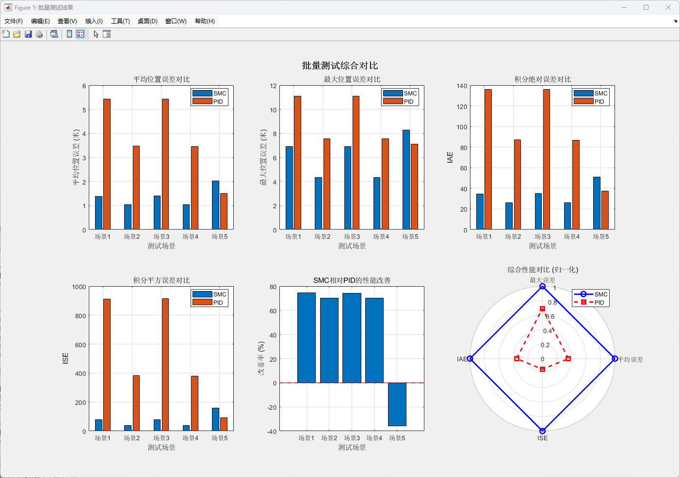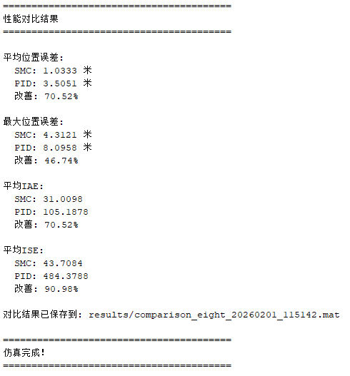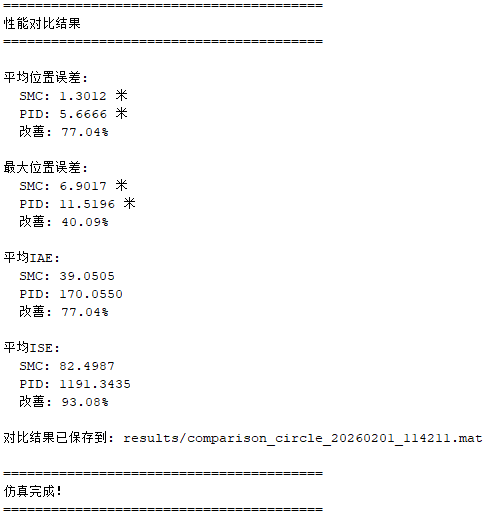 结论:这组数据非常宝贵,它证明了没有绝对最优的控制器,只有最适合特定场景的控制器。对于包含大量直线段的简单轨迹,经过好调参的PID完全可以与SMC竞争甚至在某些指标上超越;而对于复杂曲线轨迹(圆形、八字),SMC的自适应优势才充分体现。这是一个完美的对比实验系列!