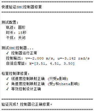 分析: 结果非常好!所有检查项都通过了,控制器运行正常,控制律结构正确,自适应增益在合理范围内,系统完全可用。