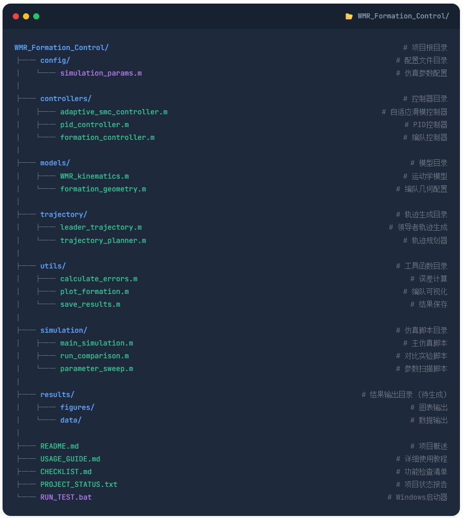仿真实验完成后,系统提供多种结果查看方式。实时查看时,仿真过程中自动显示编队运动动画,展示机器人位置、轨迹和编队连线;仿真结束后,弹出包含6个子图的结果窗口,显示轨迹对比、误差曲线、控制输入和性能指标统计。离线查看时,仿真数据保存在results/目录下,MAT文件包含完整的时间序列和控制历史,TXT报告记录7项关键性能指标,便于对比不同实验表现。批量测试模式生成SMC与PID的性能对比报告,包含雷达图和详细对比表格。此外,project_files.html文件清单页面可在浏览器中查看项目结构和统计信息。