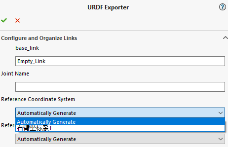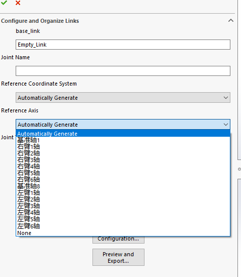 自动生成的参考旋转轴和参考坐标系导出模型会存在一系列问题,刚开始接触时我也是图方便使用自动生成,后来发现导出的模型关节之间错位,关节方向逆转等问题,当然这些问题可以在生成好的Urdf文件内修改,但很麻烦,需要一点点去试坐标原点。