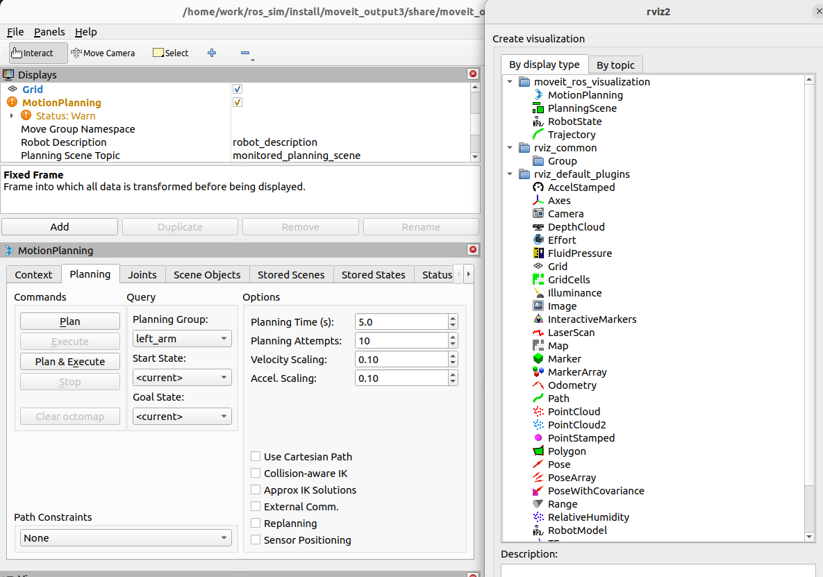 完成上述修改与调整后,应该就能正常打开rviz进行运动规划了,注意,每次修改调整过后,请重新编译,并加载 ROS 工作空间的环境变量。如果嫌麻烦,将该命令写入配置文件,即可实现永久生效。终端每次启动时,会自动读取并执行其对应的配置文件中的命令。