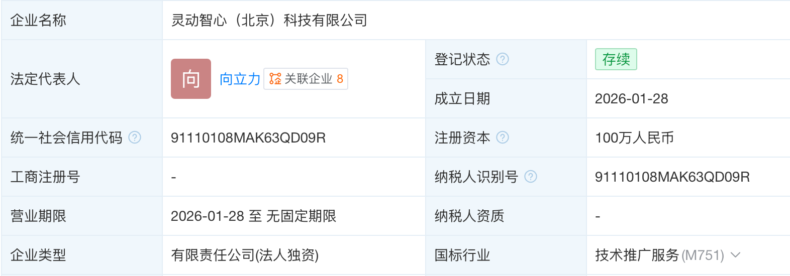 2月2日,企查查APP显示,灵动智心(北京)科技有限公司成立,法定代表人为向立力,经营范围包含智能机器人销售、工业机器人销售、特殊作业机器人制造、工业机器人安装、维修等。股权穿透显示,该公司由灵心巧手(北京)科技有限公司全资持股。灵心巧手加速产业链布局,从核心零部件向系统集成延伸。