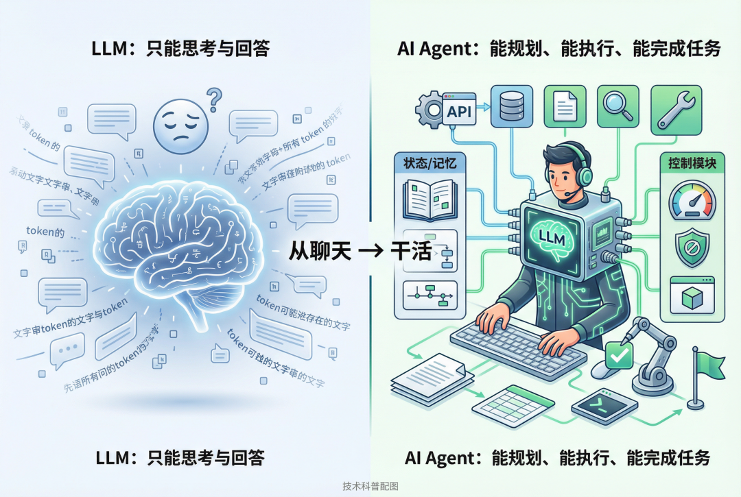 文章解析了AI Agent的本质及其四大核心模块:1)大语言模型(LLM)作为大脑负责思考和决策;2)工具模块让AI执行实际操作;3)状态与记忆模块保存工作过程信息;4)控制与调度模块确保系统安全和边界。这些模块协同工作,使AI从"会聊天"转变为"能干活",成为真正的数字员工。