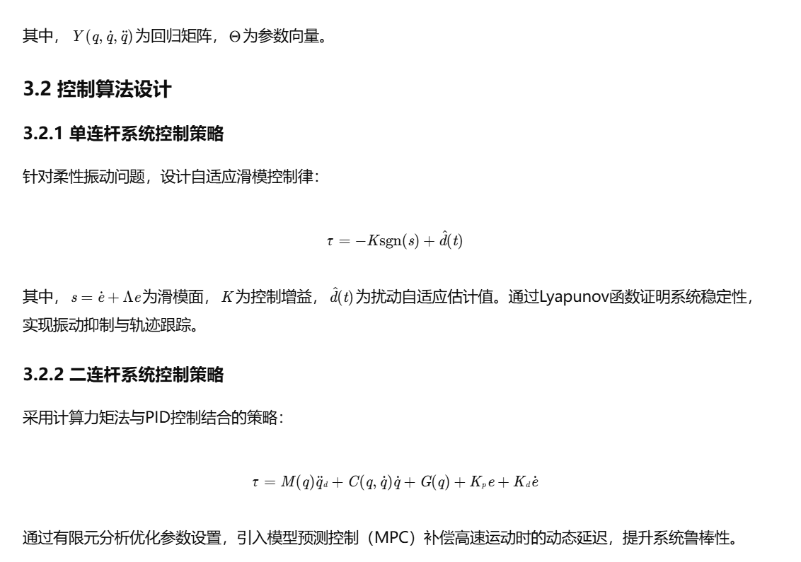 随着机器人技术的快速发展,机械臂作为核心执行机构在工业自动化、医疗手术、空间探索等领域的应用日益广泛。单连杆与二连杆系统作为机械臂的基础结构形式,其控制精度直接决定了末端执行器的操作能力。传统控制方法多基于关节位置或速度反馈,但在高负载、高速运动或复杂环境干扰下,传统方法易出现轨迹跟踪误差大、抗干扰能力弱等问题。计算力矩法(Computed Torque Control)作为一种基于动力学模型的反