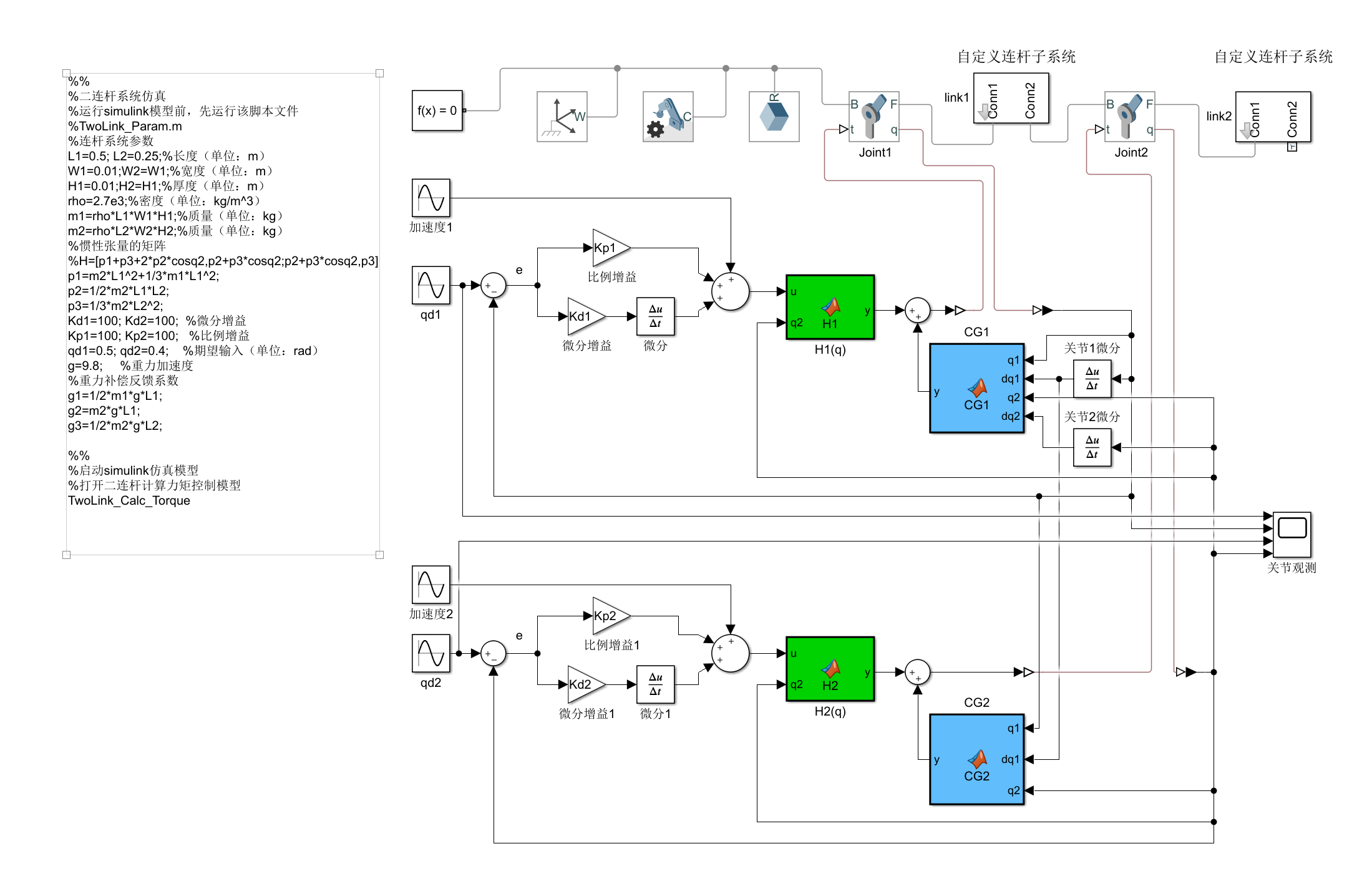 单连杆和二连杆系统计算力矩法控制simulink仿真