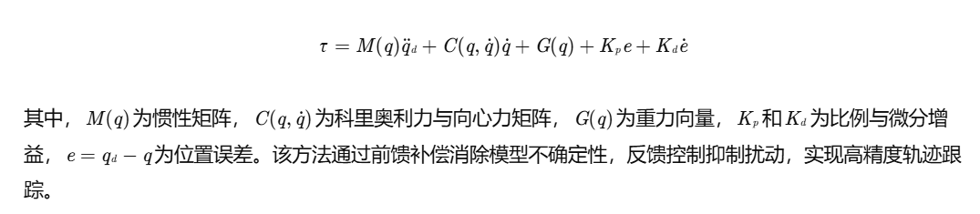 计算力矩法基于拉格朗日动力学方程,通过构建系统动力学模型,将非线性耦合项转化为前馈补偿项,结合反馈控制实现精确力矩输出。其核心公式为: