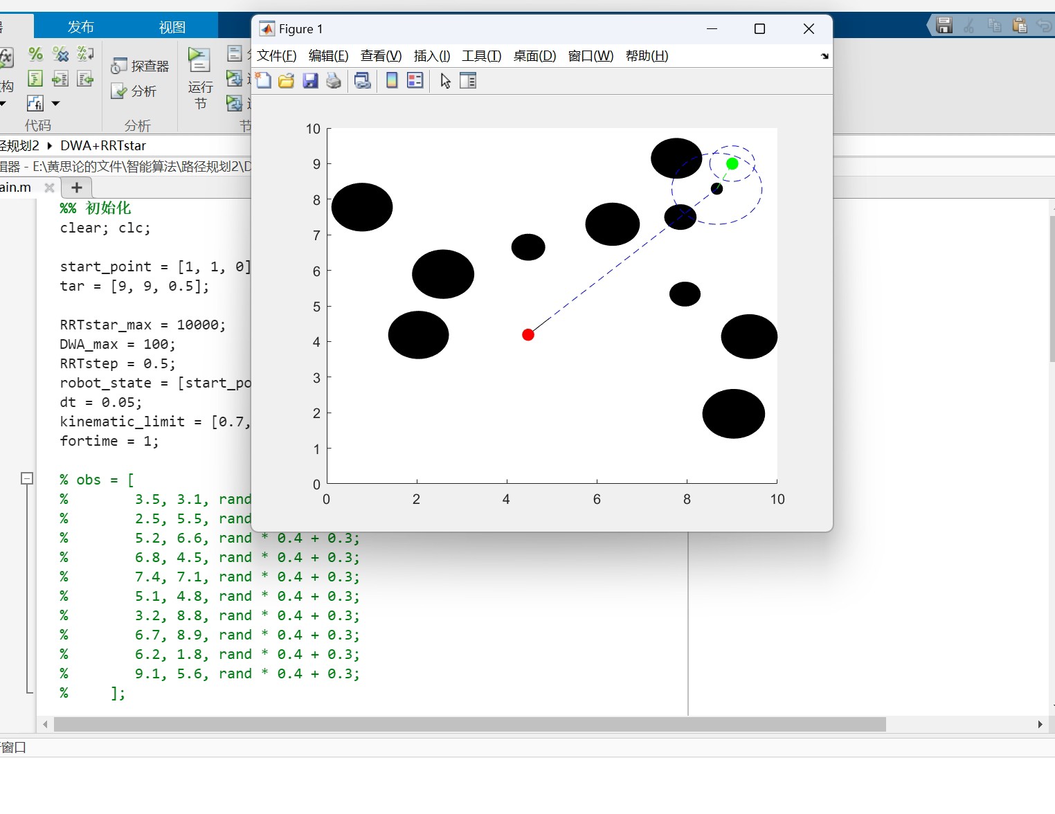 这段代码先用 rrtstar 生成全局路径,然后机器人沿着全局路径分段前进,每段使用 dwaalgorithm 调整路径,以适应动态环境。