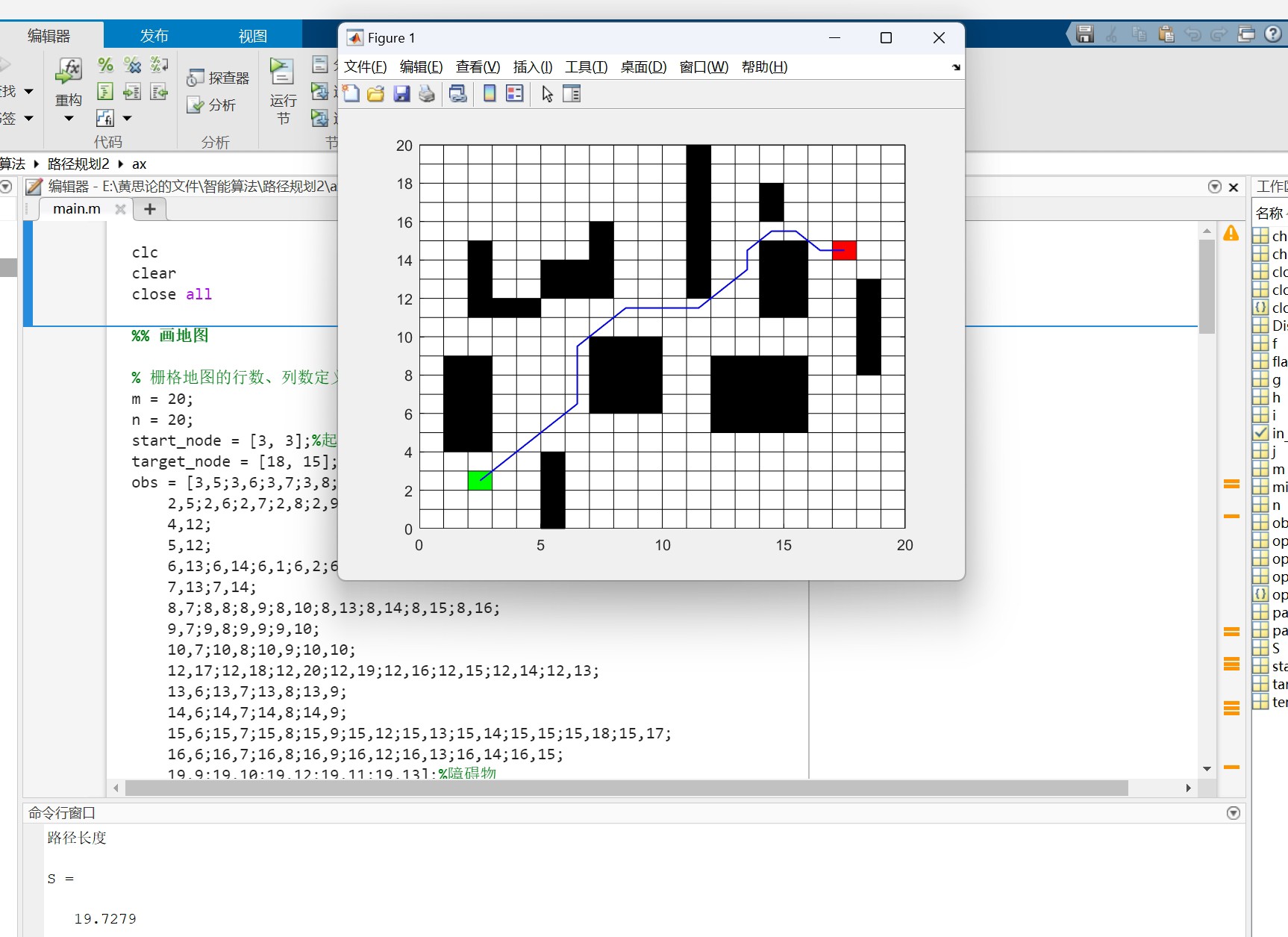 为了测试这些算法,我们可以自定义地图。以简单的二维地图为例,地图可以用二维数组表示,0 表示自由空间,1 表示障碍物。