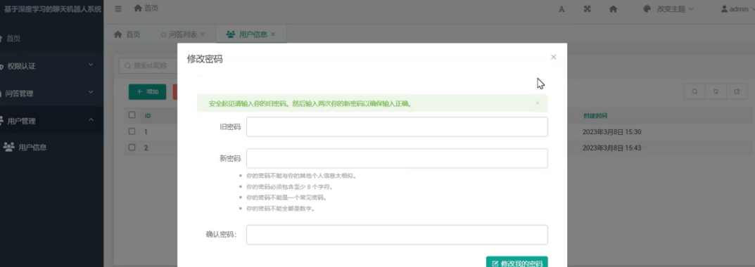 (1)个人信息管理:管理员用户可以通过此功能对自己的密码进行维护。