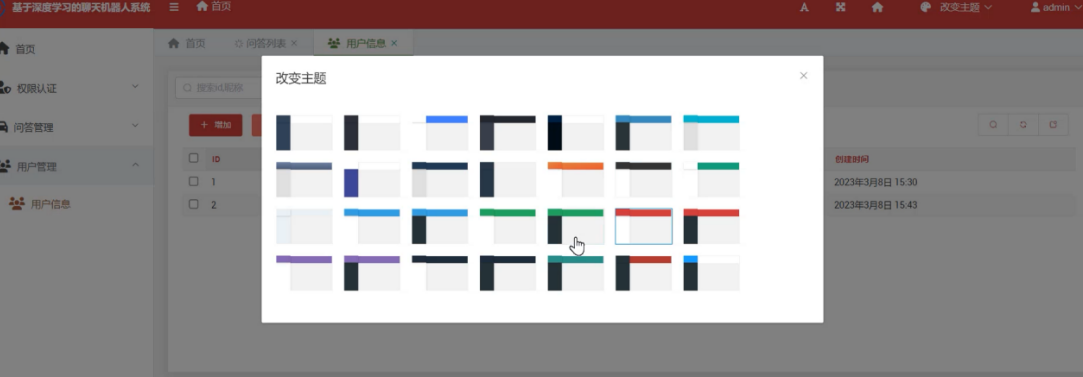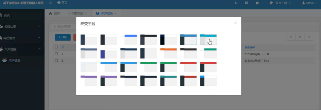 本系统设置了多种主题及字体,当用户点击界面右上方的改变主题时可以看到所有内置的主题格式,不同的主题有不同的界面颜色及内容排版方式,当用户选择了不同的主题后界面会进行切换。
