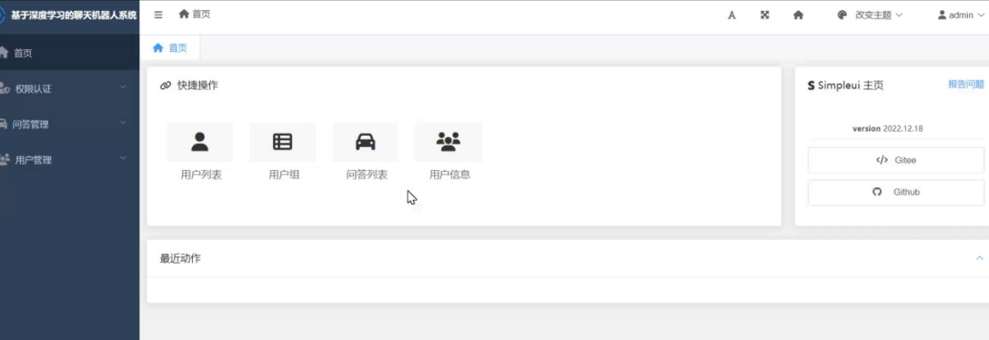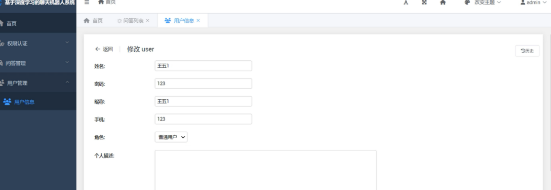 基于Python+Django的智能聊天机器人系统,包含用户和管理员两种角色。主要功能包括:用户注册/登录、个人信息管理、在线智能聊天、问答记录查询、主题切换等。管理员额外拥有用户管理权限。系统采用MySQL数据库,前端使用HTML框架,实现了人机交互对话、历史记录查询等功能。项目包含完整源码,适用于毕业设计或学习参考。
