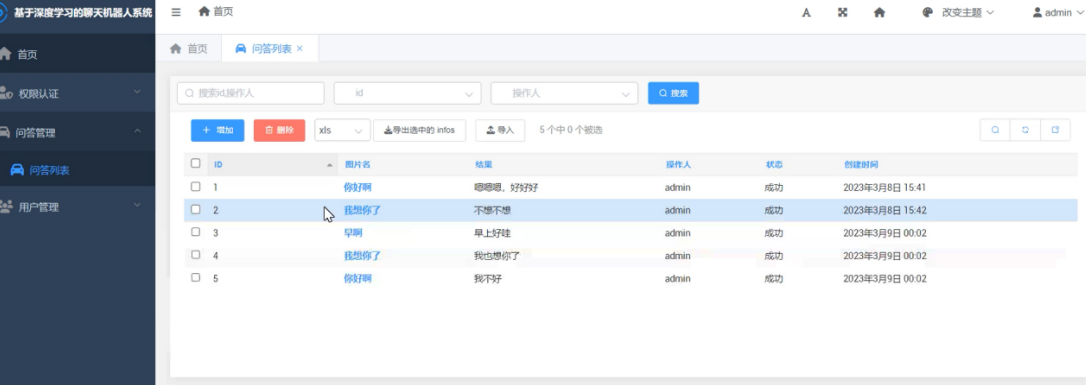系统中所有的聊天及问答的记录都可以通过此功能进行查询,在列表中可以查看到用户发送的信息及系统进行回复的信息,还可以看到具体的操作人和操作状态等。在数据列表的上方可以通过id及操作人对信息进行搜索