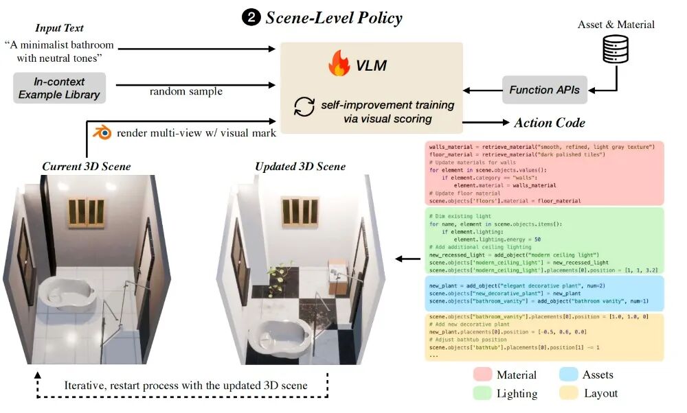随后VLM会直接输出代码形式的具体动作指令,比如添加资产、调整光照、更换材质等,这些代码指令会对接3D环境的工具API,API自动执行指令,实时更新整个3D房间。