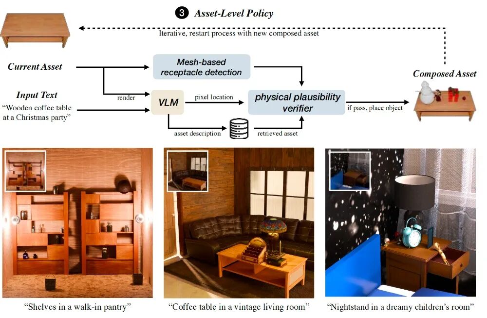 资产级策略生成的场景平均CLIP分数达0.282,高于基线方法的0.269,可自然实现小物体的语义对齐和物理合理放置,避免物体重叠。