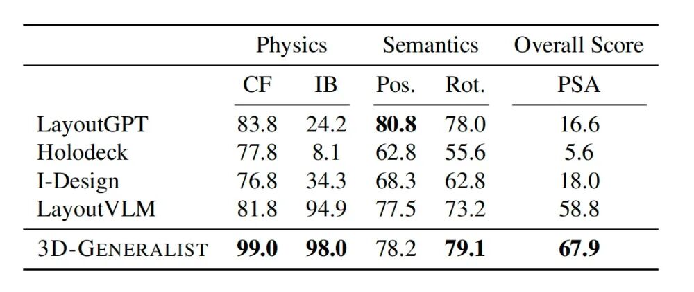 物理合理性方面,3D-GENERALIST的无碰撞分数达99.0,边界内分数达98.0。语义一致性方面,其位置连贯性和旋转连贯性的分数分别为78.2和79.1,综合物理语义对齐分数达67.9,远高于基线最高值58.8。