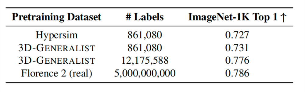 基于3D-GENERALIST生成的合成数据预训练视觉模型ImageNet-1K Top-1,使用86万条标签训练时,准确率达0.731,超过基于人工构建的HyperSim数据集。