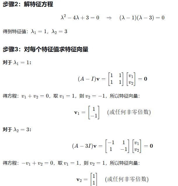 2、求特征向量对每个特征值λi,解齐次线性方程组: