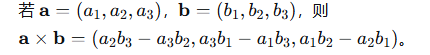 几何意义:结果向量垂直于a和b,方向由右手定则确定,长度 ∣a×b∣=∣a∣∣b∣sinθ,表示以a、b为边的平行四边形面积。