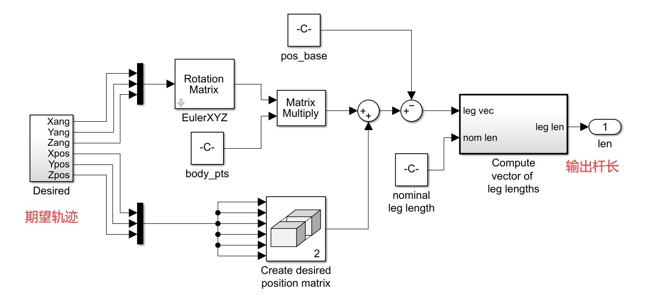 这里简单定义了底座和平台的质量、惯性以及杆件长度,实际建模中这些参数需更精确地测量与计算,然后通过Simscape的机械元件模块来搭建真实物理特性的模型。