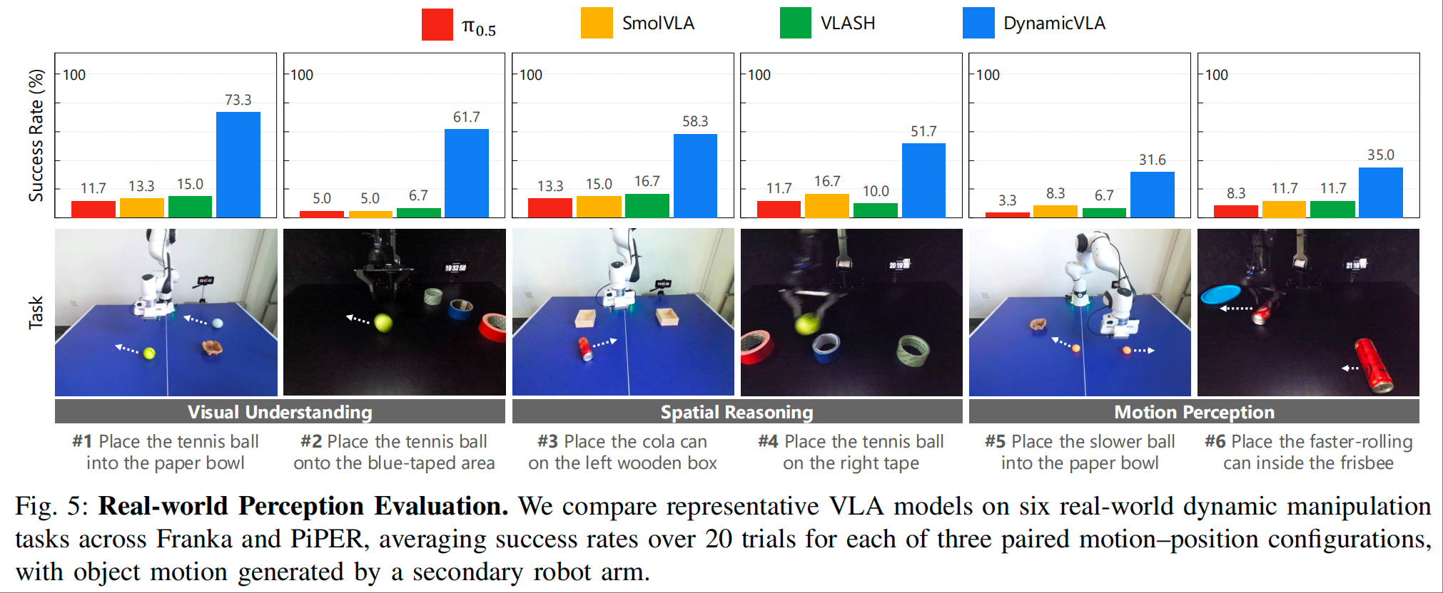 - 时空推理能力:在感知能力评估中,DynamicVLA 在视觉理解、空间推理、运动感知任务中的成功率分别为 51.5%、48.0%、33.5%,真实世界场景综合成功率达 51.9%,远超基线模型的 11.7%。如图 5 所示,在 “放置更快滚动的可乐罐” 任务中,模型能精准识别运动速度特征并完成指定操作;而基线模型因难以兼顾动态感知与空间定位,在 “将网球放在右侧胶带区域” 等需要空间推理的任务中成功率不足 15%。这一结果表明,DynamicVLA 能精准识别动态场景中的目标物体、推断物体与目标位置的相对关系,并准确预判物体运动轨迹,为动态操纵提供可靠的感知支撑。